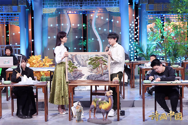 值得一提的是,节目还借助手工班共创环节,给出对传统诗画文化、江河文明的解读和创作。第三期节目中,围绕清代画家袁江所绘的《春江花月夜》轴,手工班成员陈鹏翔融合石英砂、宣纸、花草叶片等多种材质,运用中国传统绘画的构图法则和笔墨技巧,营造出春江月夜的独特氛围与情感意境——当人们尝试发出自己的声音和过去对话、向江河问好,又何尝不是在创造属于自己的历史?