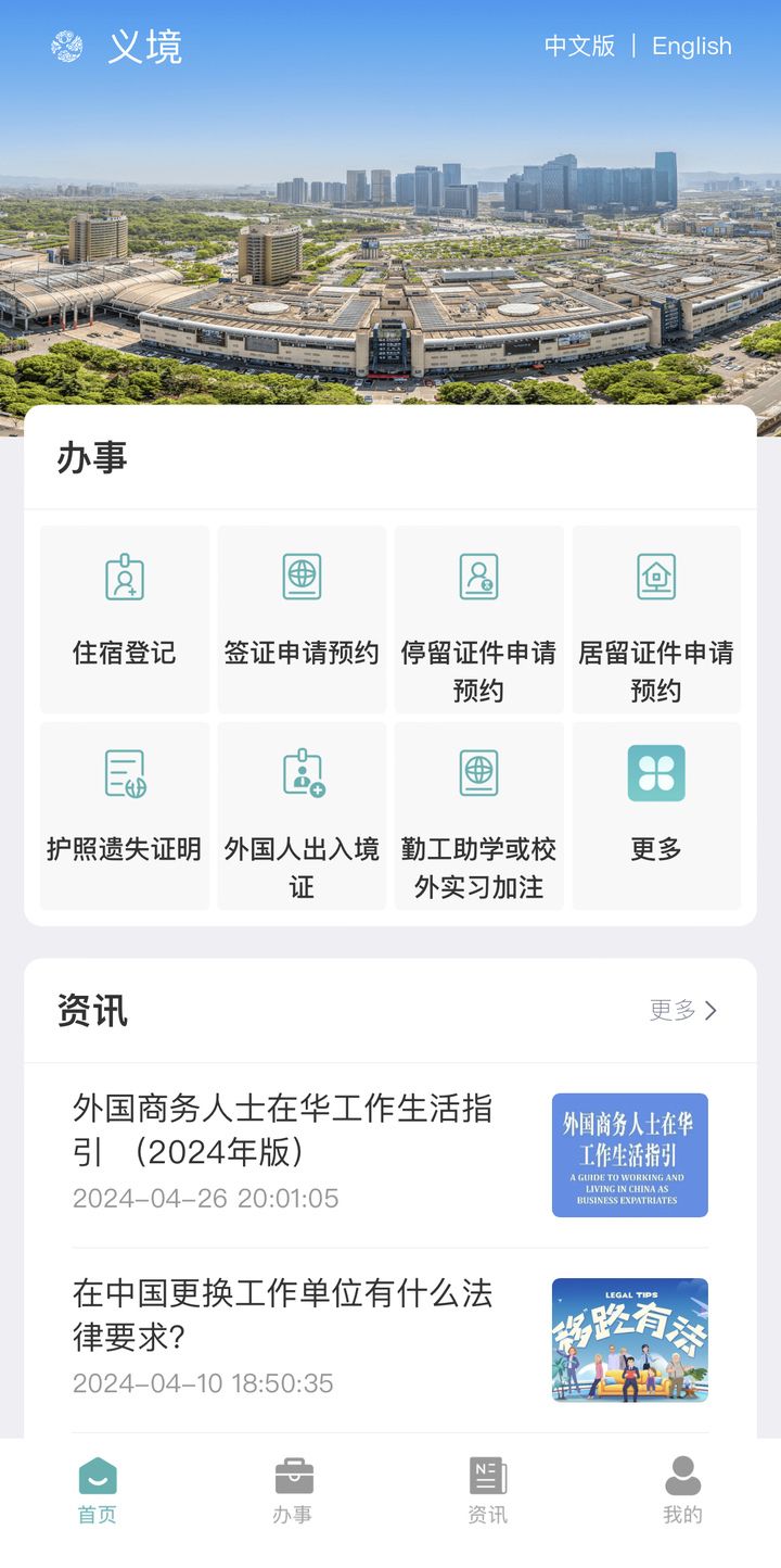 涵盖126项咨询业务,17项在线办理业务的“义境”APP,是一个为外商提供“衣、食、住、行、商”等全方位服务的线上集成式平台。在政务办事上,可实现住宿登记、签证、工作许可等事项的咨询、预约和在线办理;商务领域,推出了外商投资、个人外汇结算账户办理等“一件事”线上办事场景;还汇总了各类便民服务信息,为外商线上提供智能索引和个性化服务。