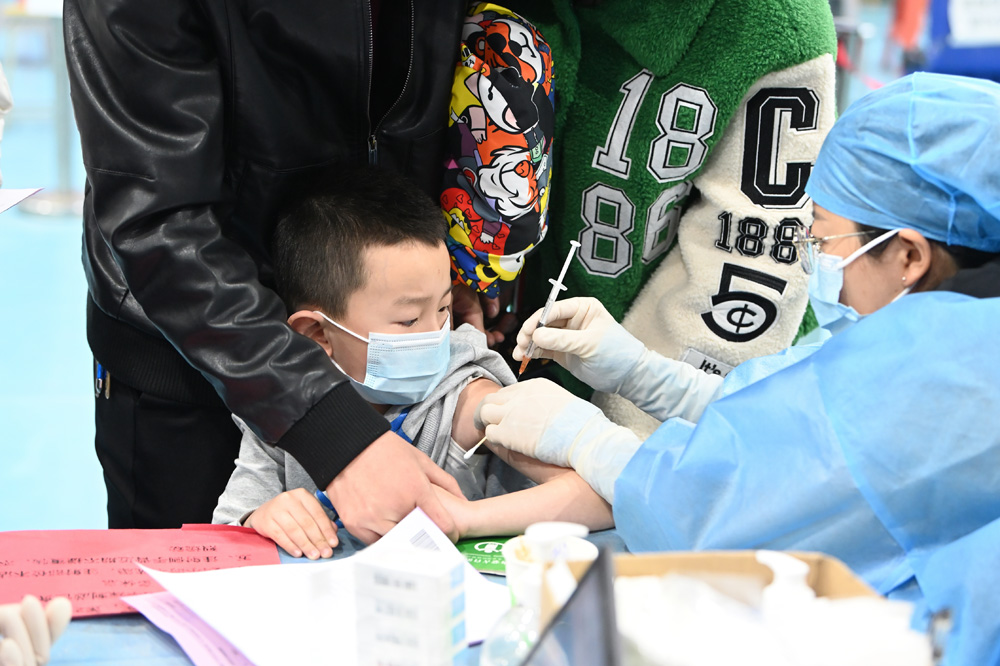 2月12日,呼和浩特市回民区新冠疫苗第二临时接种点内,一位小朋友接种新冠疫苗。(图片来源:中新社)