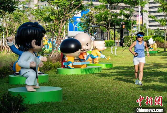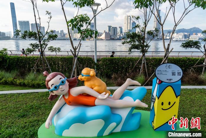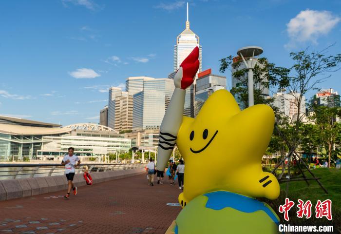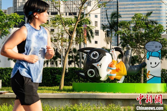 图为动漫形象雕塑“陪伴”在维港海滨跑步健身的市民。