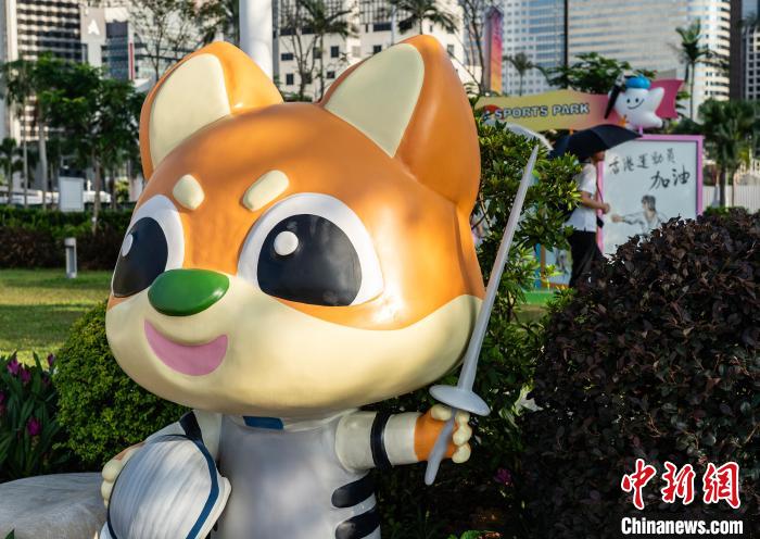 图为香港特区政府康乐及文化事务署吉祥物“活力仔”扮成击剑运动员的雕塑。