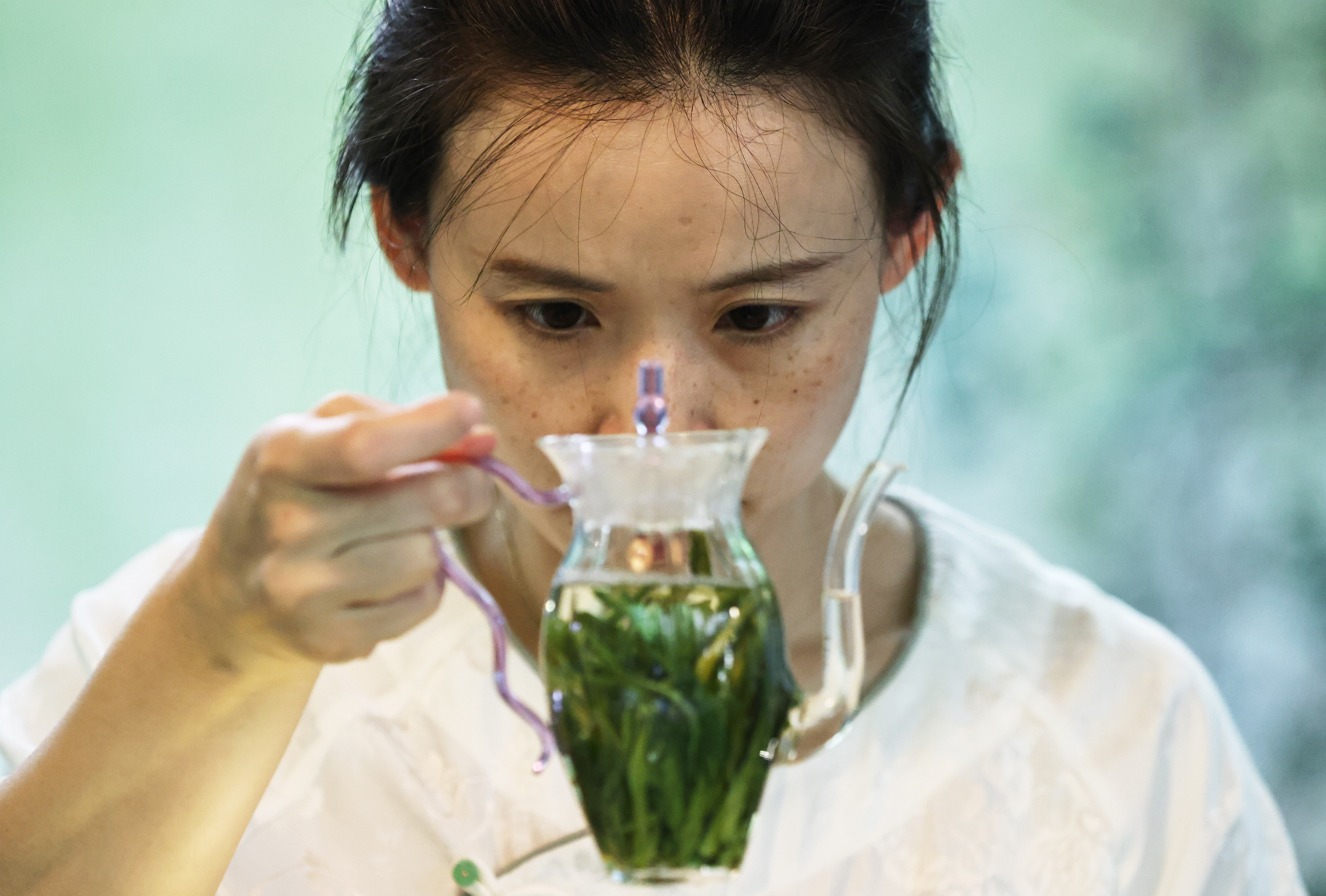 谈到正在筹备的新茶馆时,张乐说:“每个时期的中国茶都有自己的特点,我会保留传统精髓部分,也会表达一些新的态度,让法国人看到中国茶更多的可能性。”图为6月27日,茶艺师张乐在法国巴黎的“一乐也”中国茶工作室为学生上课。