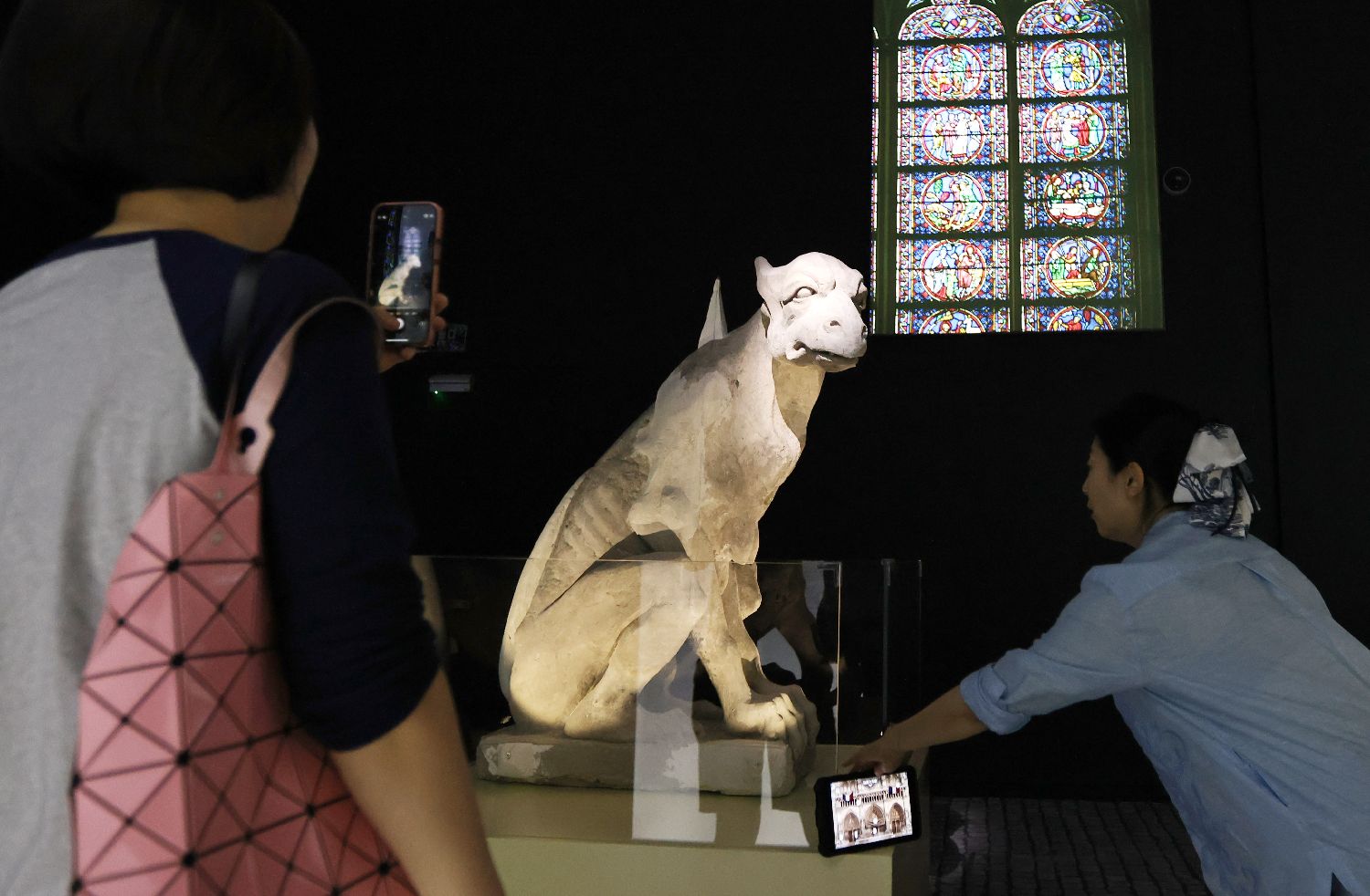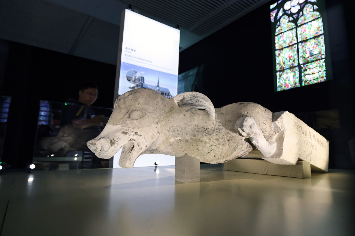 2024年9月12日,观众在中国国家博物馆参观原位于巴黎圣母院南侧山墙上的19世纪石像怪。当日,作为献礼中法建交60年暨中法文化旅游年重点项目,“浴火重生——巴黎圣母院增强现实沉浸式展览”在中国国家博物馆对公众开放,巴黎圣母院的四件雕塑原件首次赴华展出。