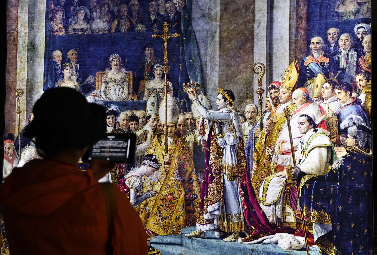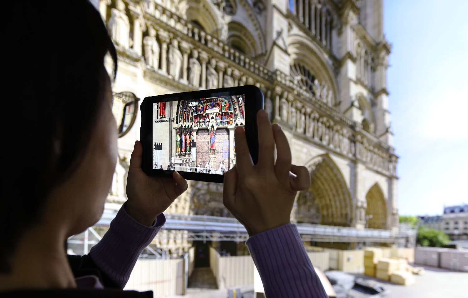 2024年9月12日,观众通过移动设备观看巴黎圣母院的著名历史事件——拿破仑一世加冕大典。此次展览借助雕塑模型,运用增强现实技术,将实体与数字技术融合。观众不仅可以“步入”过去辉煌的巴黎圣母院,还可以参观现在的圣母院工地现场,了解巴黎圣母院失火后的重修状况。