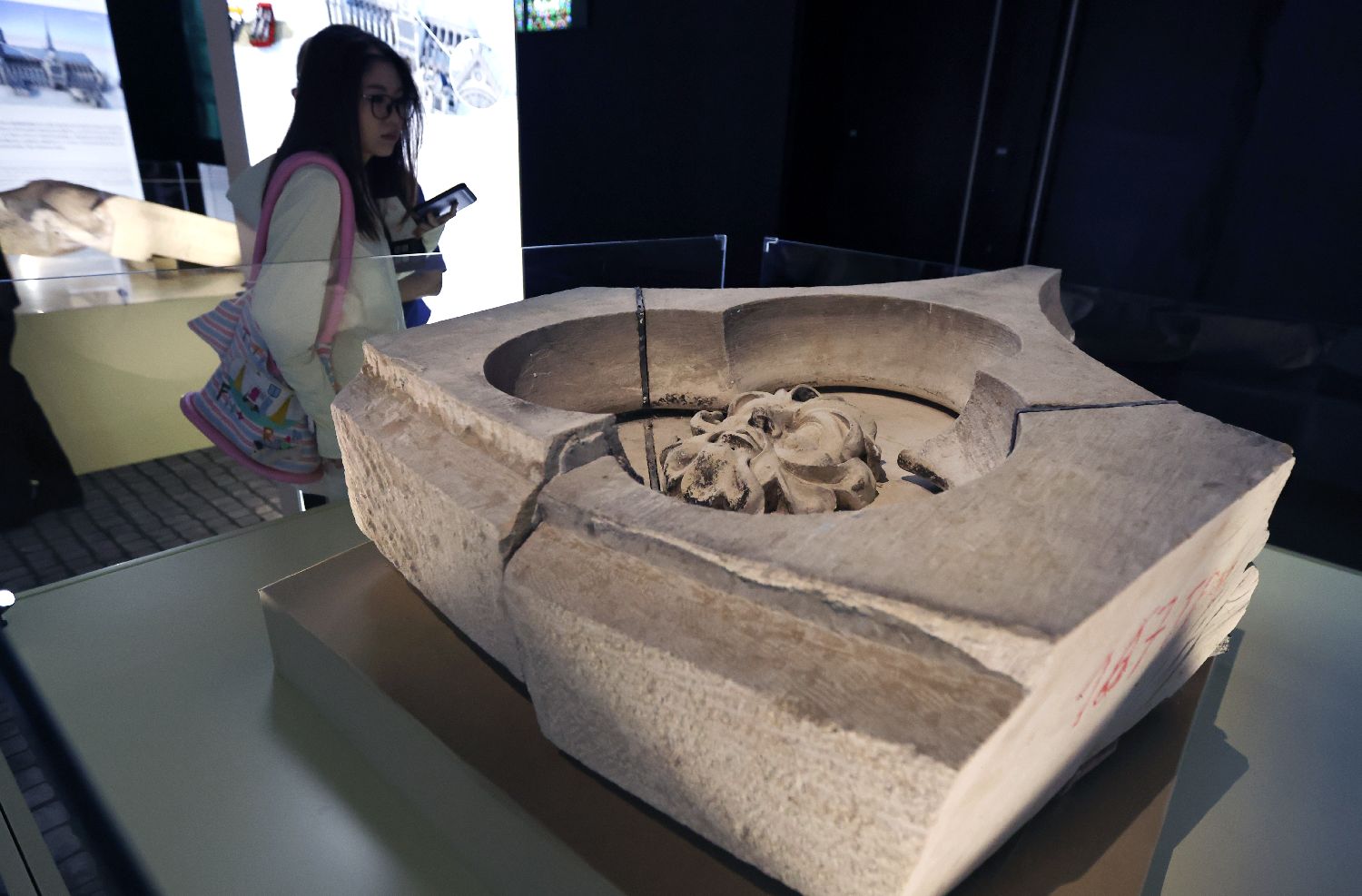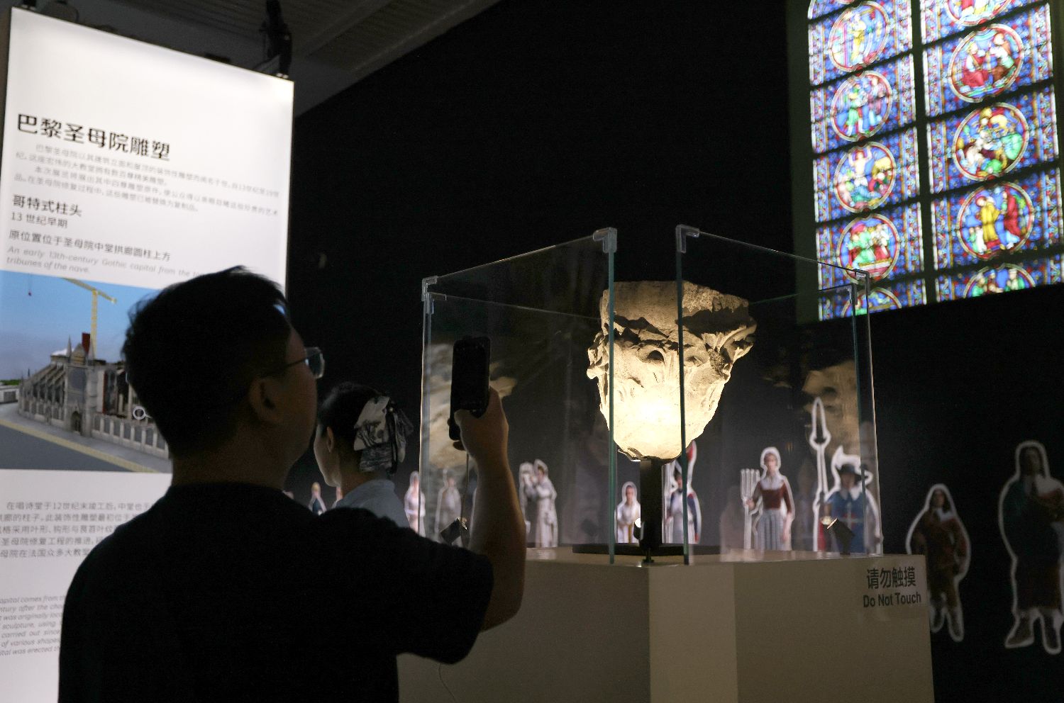 2024年9月12日,观众在中国国家博物馆参观原位于巴黎圣母院中堂拱廊圆柱上方的13世纪早期的哥特式柱头。(卞戈/图)