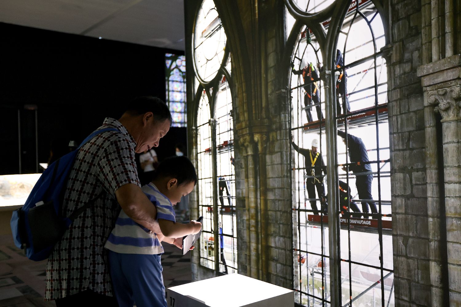 2024年9月12日,观众在展览现场通过移动设备参观巴黎圣母院施工现场。