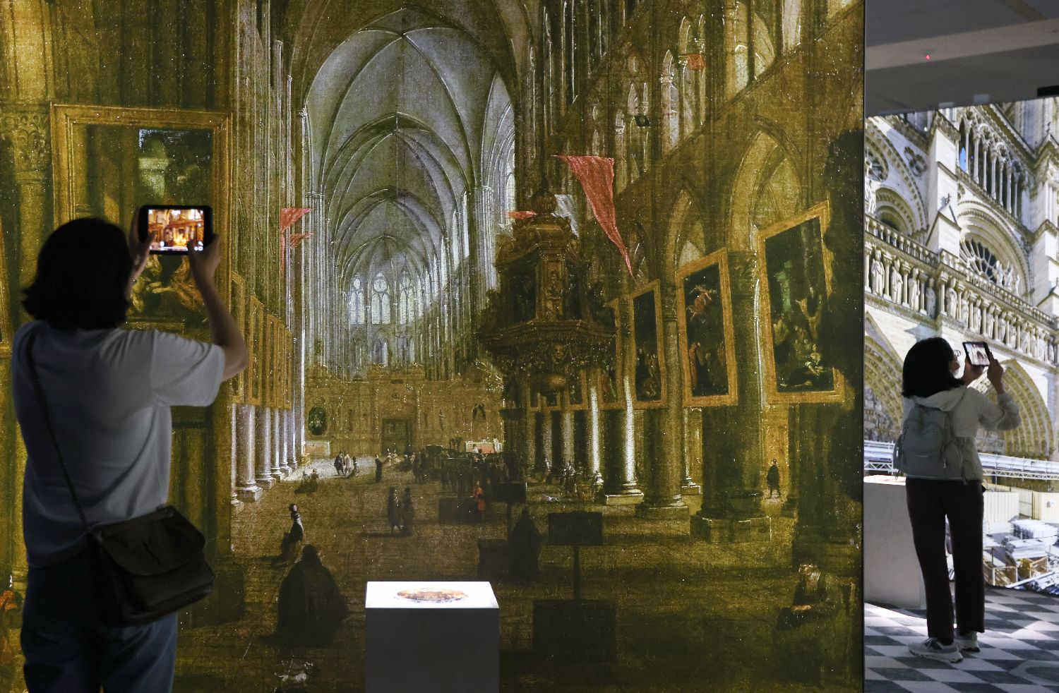 2024年9月12日,观众在展览现场通过移动设备参观过去辉煌巴黎圣母院。