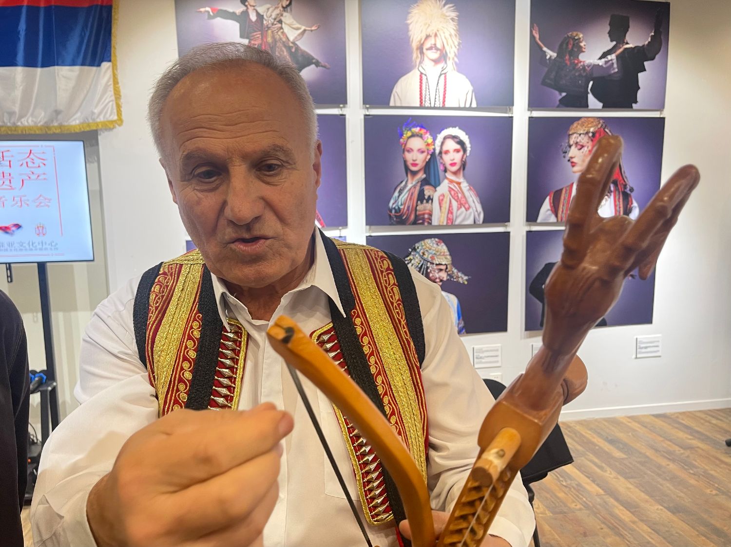 塞尔维亚文化中心主任塔尼亚介绍,古斯勒琴是塞尔维亚文化中一种独特的存在。它的琴身由樱桃木制成,琴身两面由柔软的小羊皮贴好,琴颈顶端雕刻有羊头。