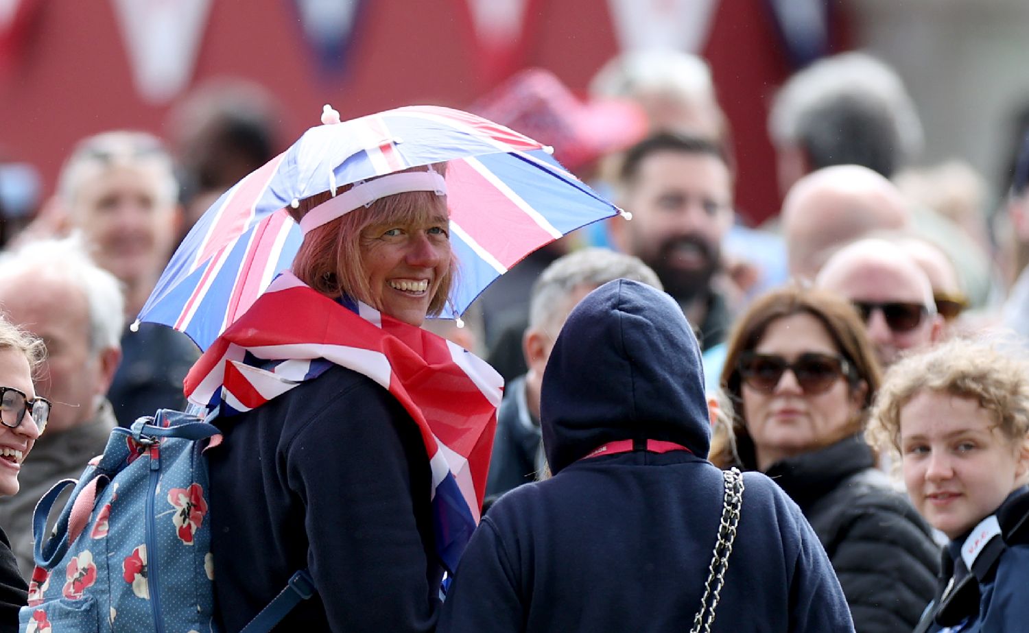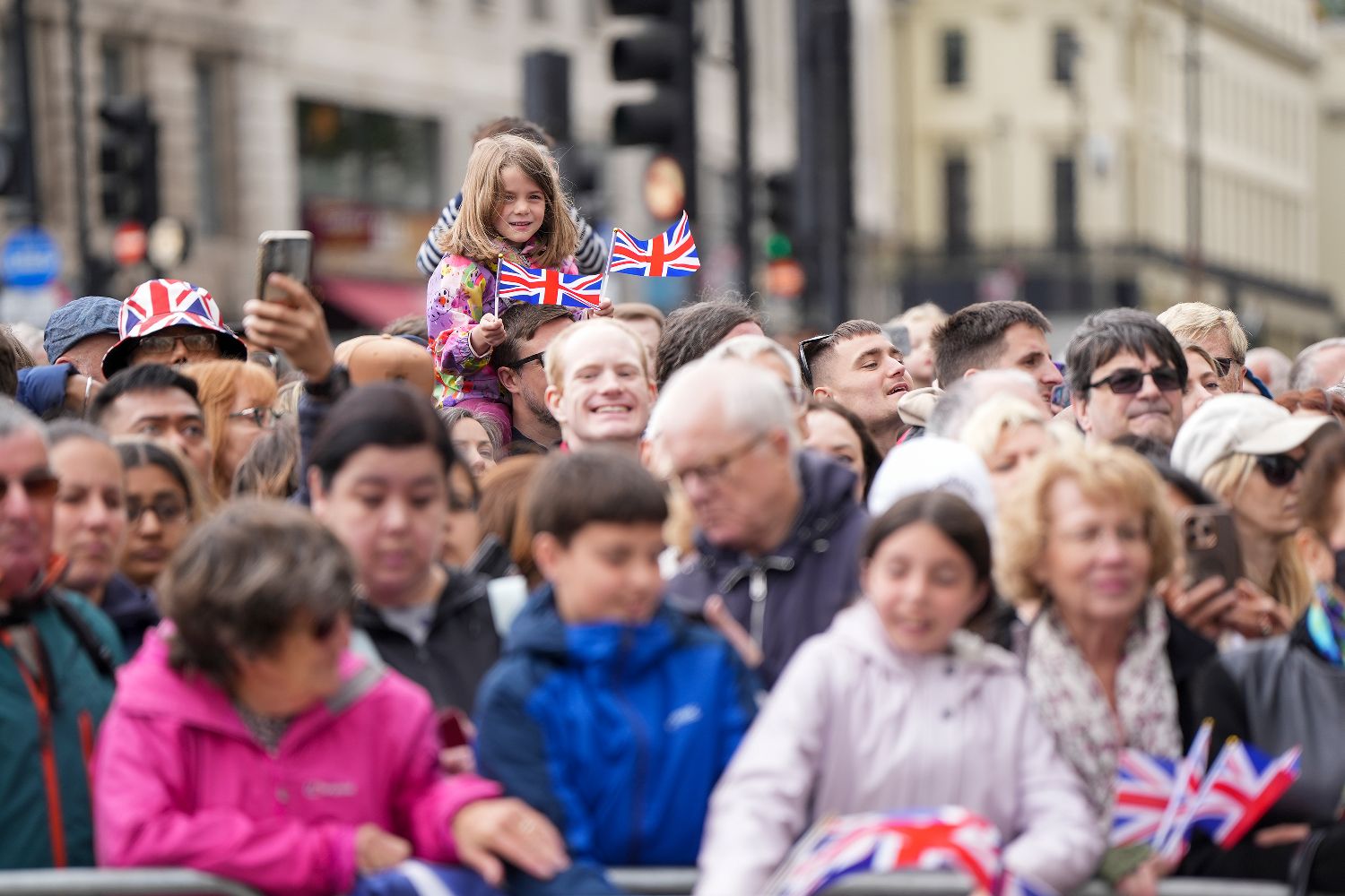 5月5日,在英国伦敦,人们观看阅兵仪式。