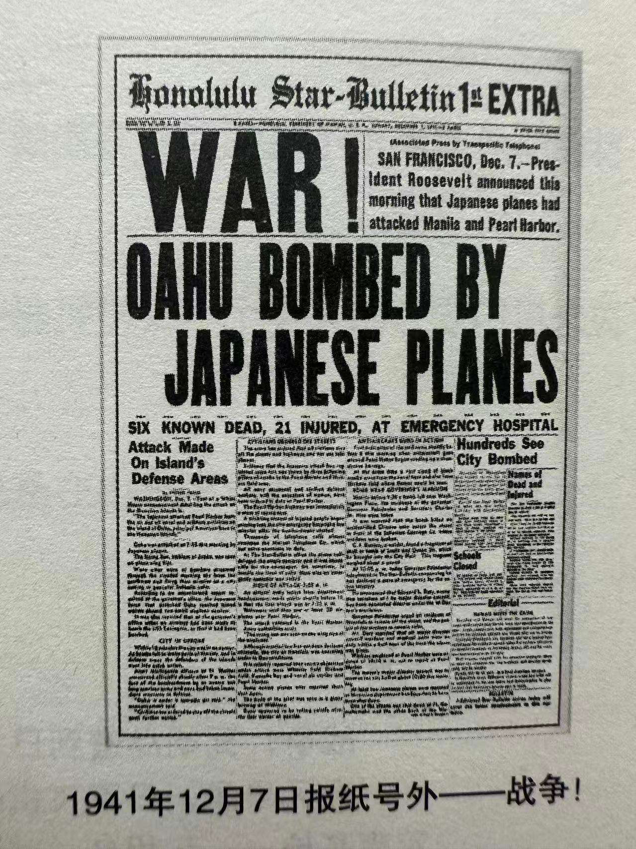 《潍县西方侨民集中营:1943—1945年》书籍内使用的报道珍珠港战事的报纸。(图片来源:欧洲时报余有 摄)