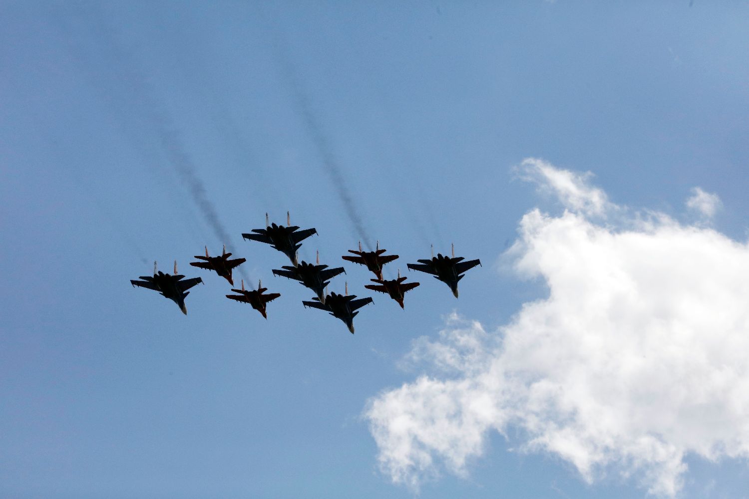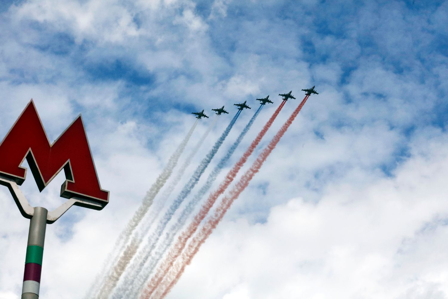 战机编队飞过莫斯科上空。