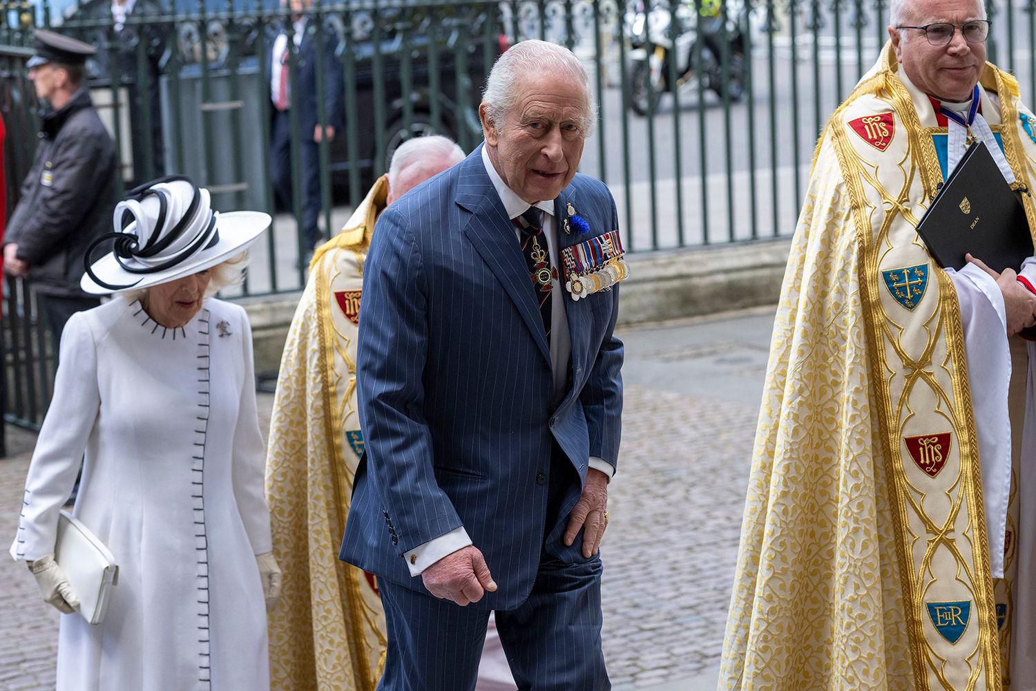 5月8日,在英国伦敦,国王查尔斯三世(中)和王后卡米拉(左)抵达威斯敏斯特教堂参加感恩仪式。当日,英国伦敦威斯敏斯特教堂举行感恩仪式,纪念第二次世界大战欧洲战场胜利80周年。(图片来源:本文图片均自新华社)