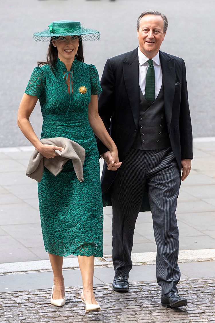 英国前首相卡梅伦(右)抵达威斯敏斯特教堂参加感恩仪式。