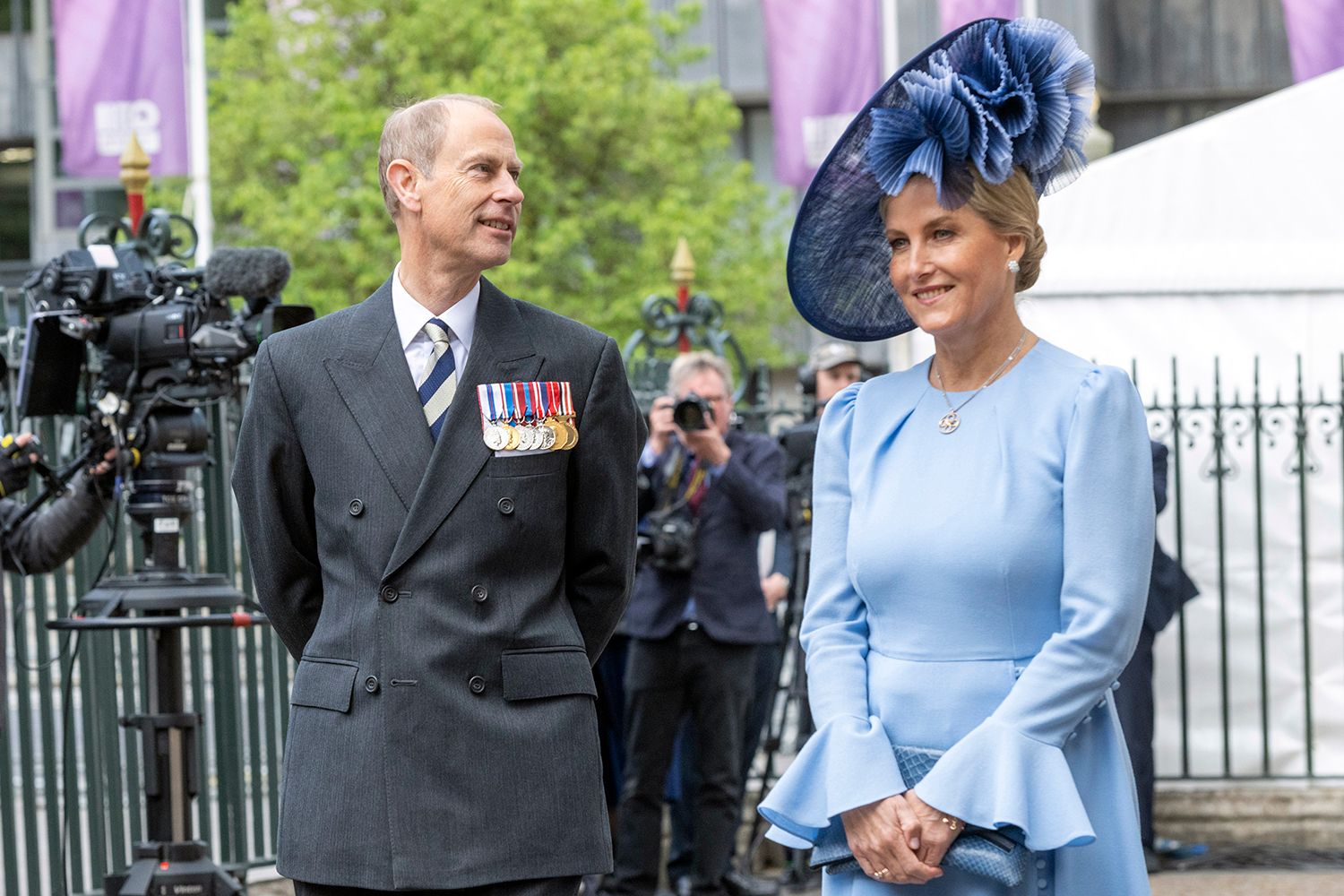 5月8日,在英国伦敦威斯敏斯特教堂,爱德华王子(左)和妻子爱丁堡公爵夫人索菲在感恩仪式后准备离开。