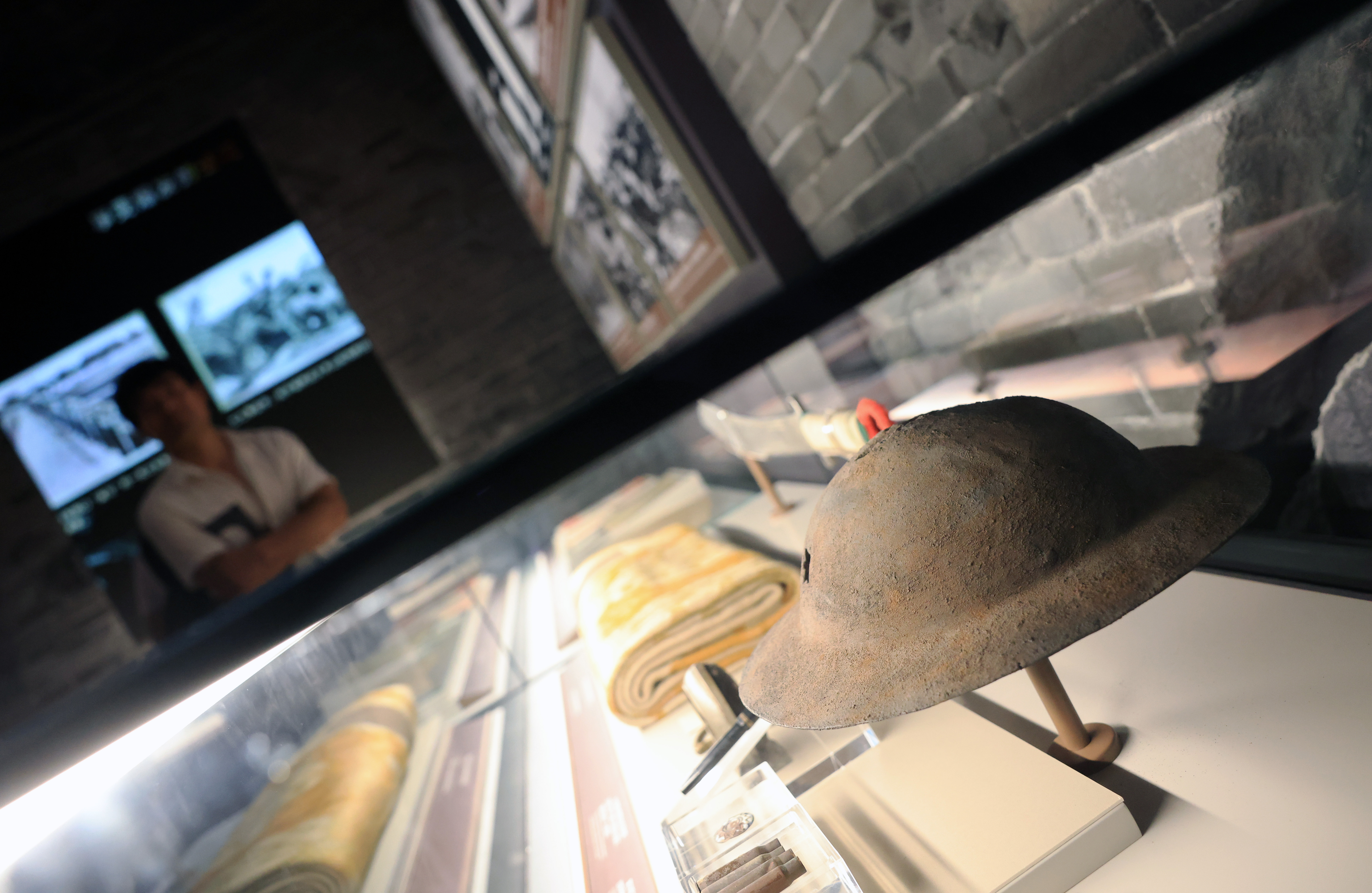 2025年7月8日,展览现场,第29军士兵佩戴的钢盔、帽徽以及遗留下来的子弹壳等文物吸引参观者驻足观看。