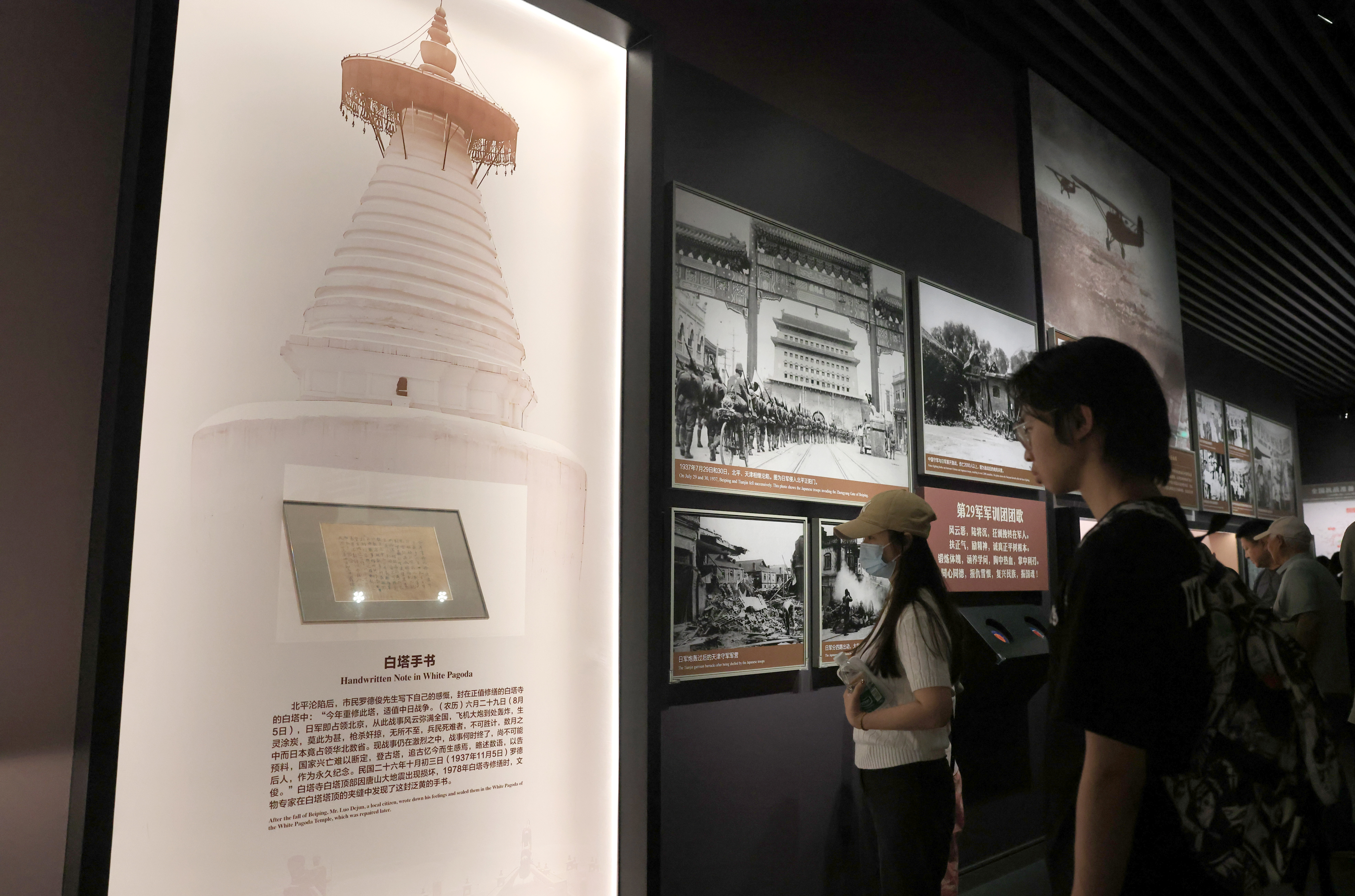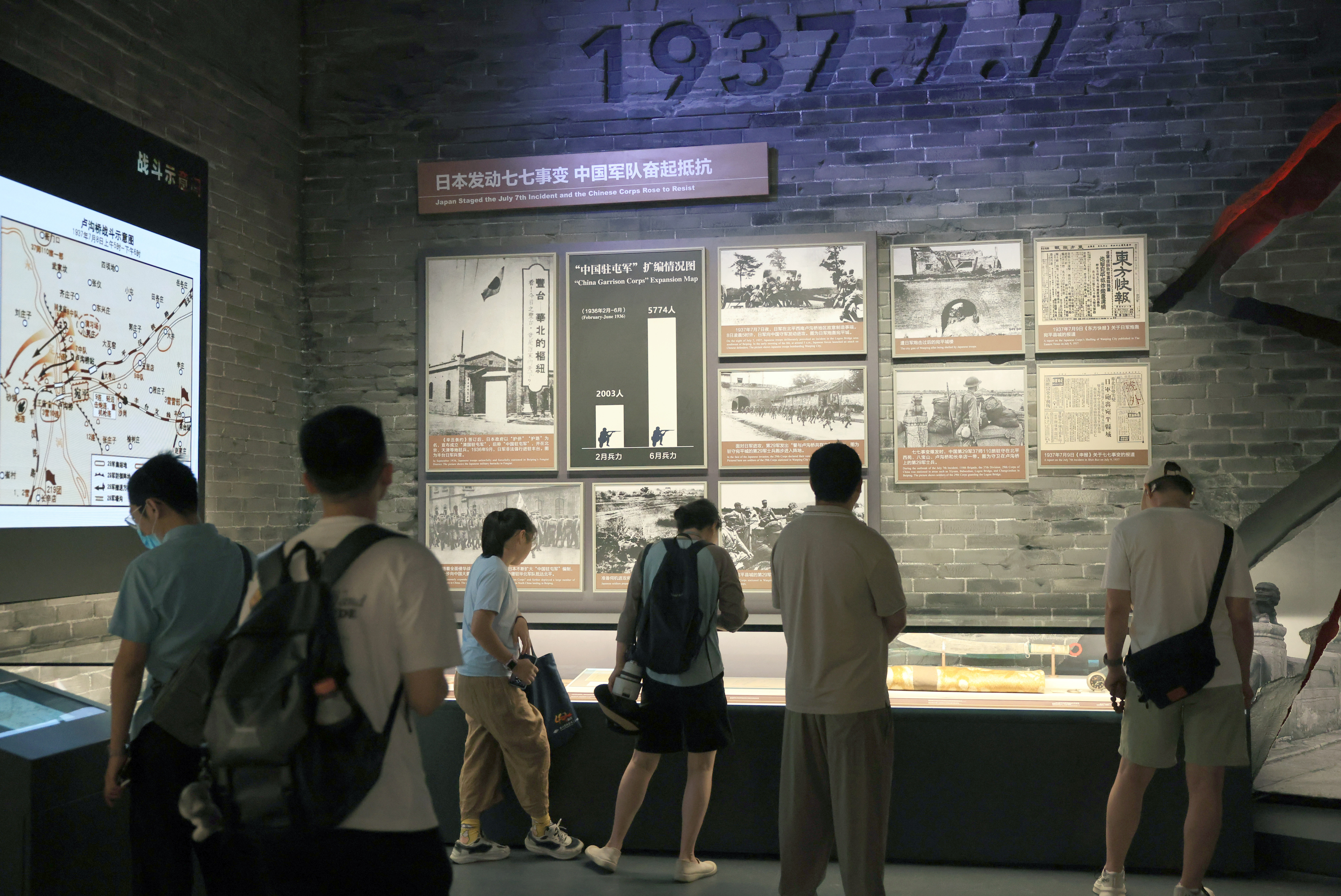 2025年7月8日,参观者在中国人民抗日战争纪念馆展厅内参观“七七事变”文物和历史照片。