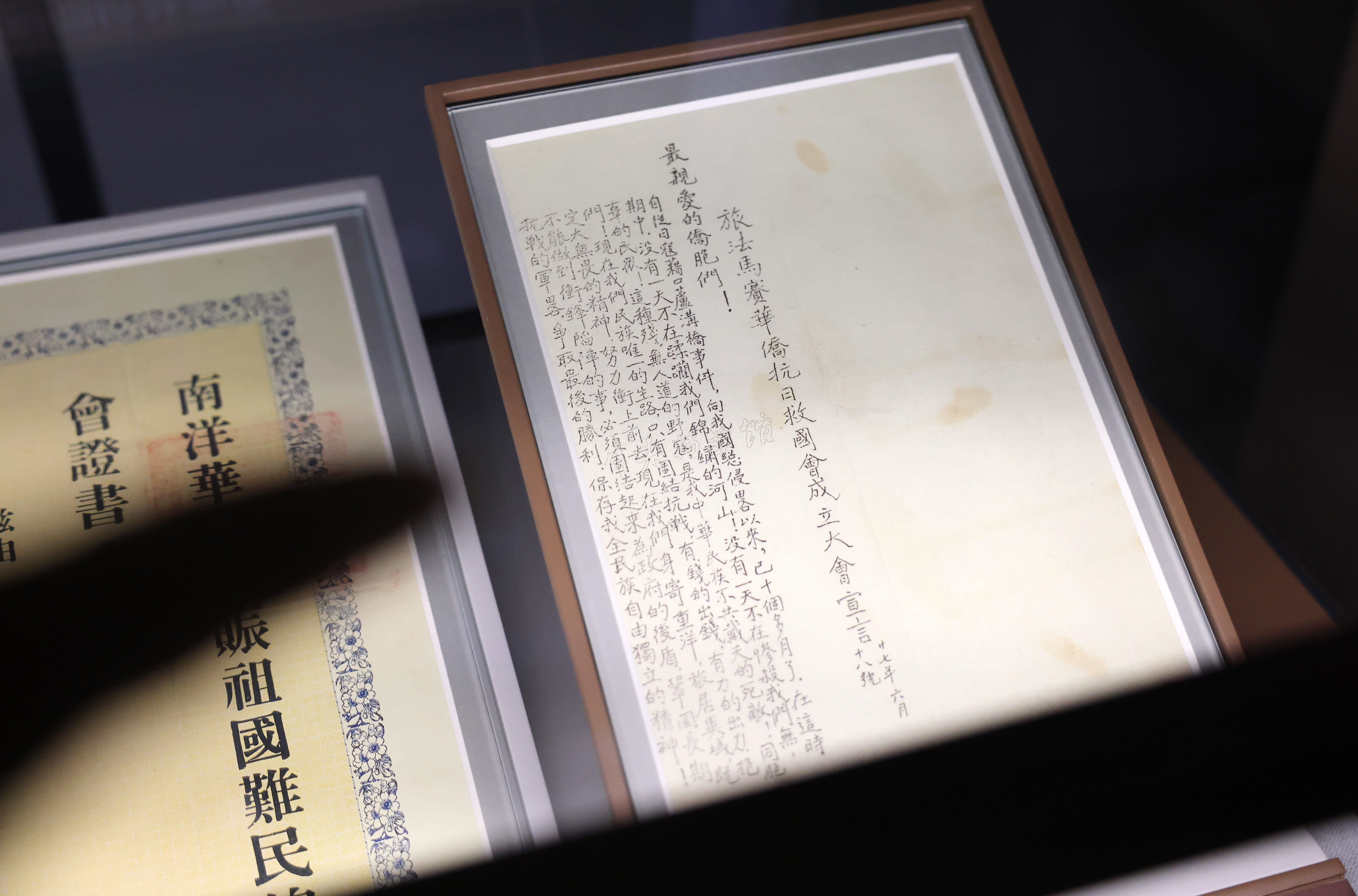 2025年7月8日,现场展出的“旅法马赛华侨抗日救国会成立大会宣言”(1938年6月18日)。