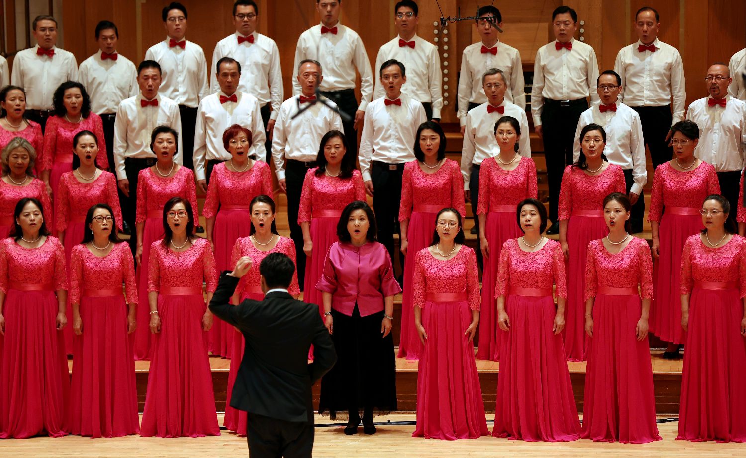 8月28日,演员在英国伦敦的“铭记历史·开创未来”主题音乐会上合唱《保卫黄河》。