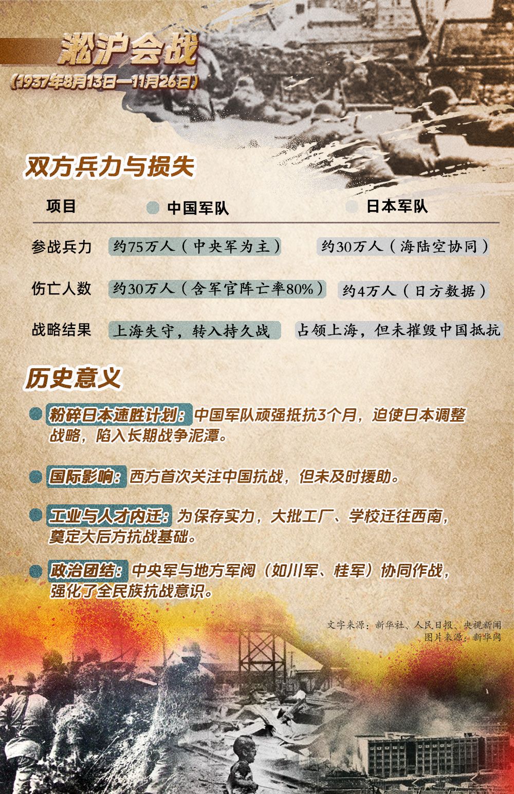 【欧洲时报网】淞沪会战(1937年8月13日—11月26日)是抗日战争中规模最大、战斗最惨烈的战役之一。中国军队以约75万兵力(中央军为主)抗击日军约30万兵力(海陆空协同),虽最终因装备落后、战术劣势被迫撤退,但粉碎了日本“三个月灭亡中国”的狂妄计划,展现了中华民族抗战到底的决心。