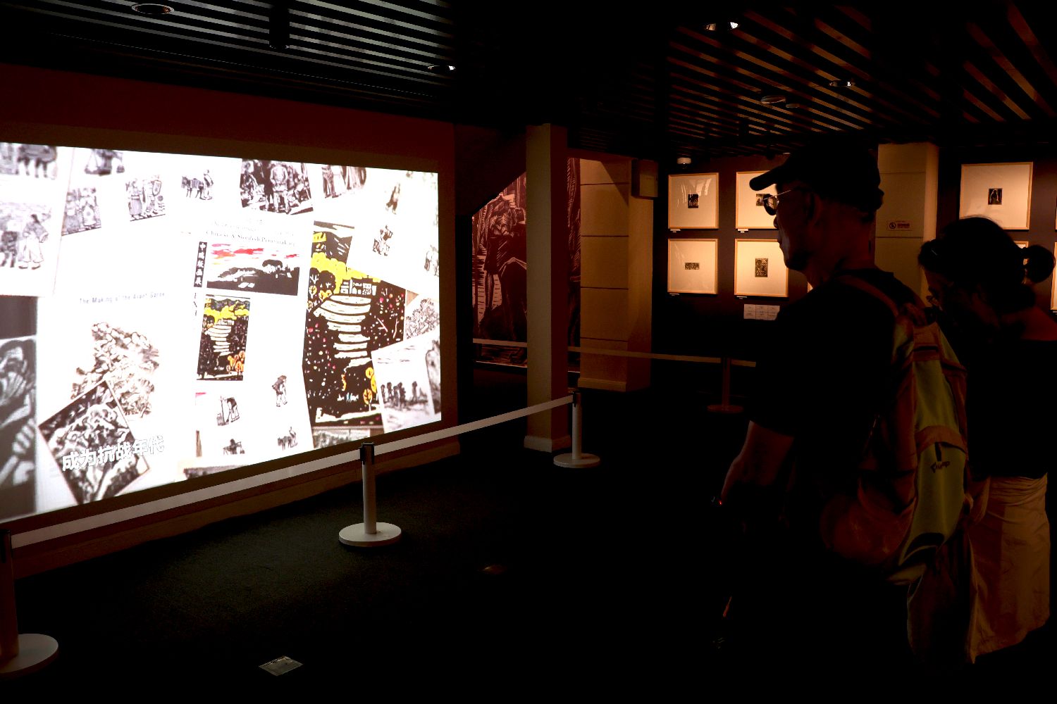 图为参观者观看主题宣传片,了解版画艺术与版画家在抗战时期做出的贡献。