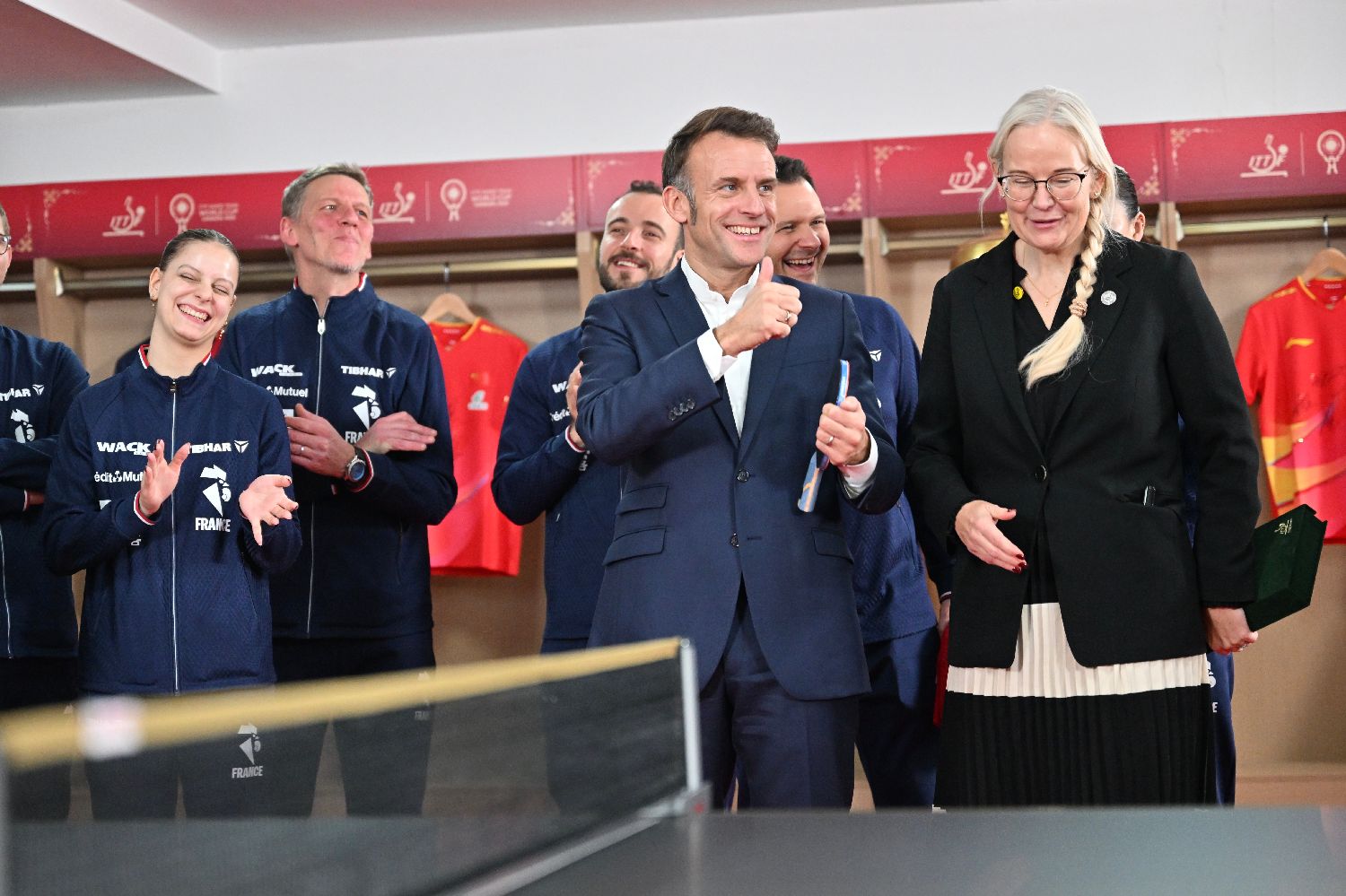 12月5日,法国总统马克龙访问四川成都期间,来到四川省体育馆看望参加混团世界杯比赛的法国乒乓球运动员,并与法国队球员一起同中国乒乓球运动员切磋球技。(图片来源:中新社)