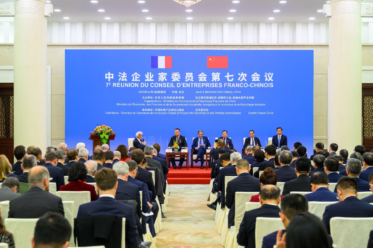 12月4日,中国商务部和法国经济、财政和工业、能源与数字主权部在北京共同主办中法企业家委员会第七次会议,150多位中法企业代表参会,围绕绿色低碳合作发展新范式、产业转型消费变革新趋势、创新领域跨境投资新机遇三个主题开展研讨。(图片来源:新华社)