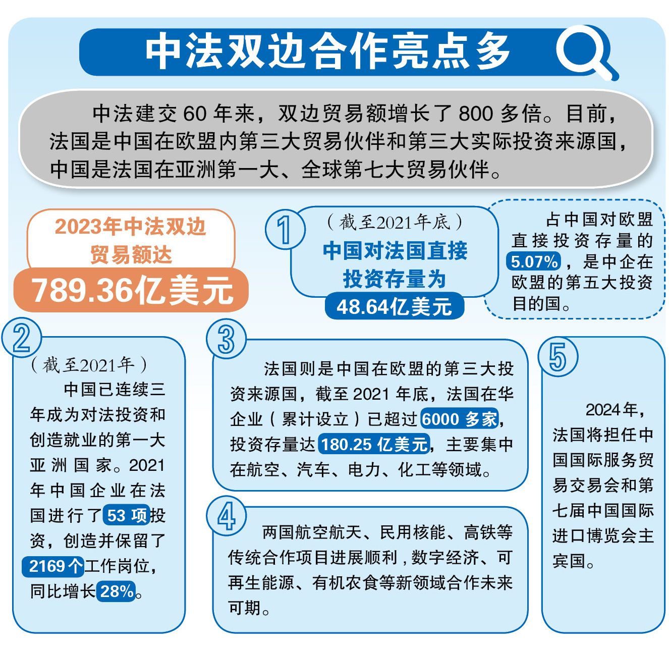 【欧洲时报网】中法建交60年来,双边贸易额增长了800多倍。目前,法国是中国在欧盟内第三大贸易伙伴和第三大实际投资来源国,中国是法国在亚洲第一大、全球第七大贸易伙伴。