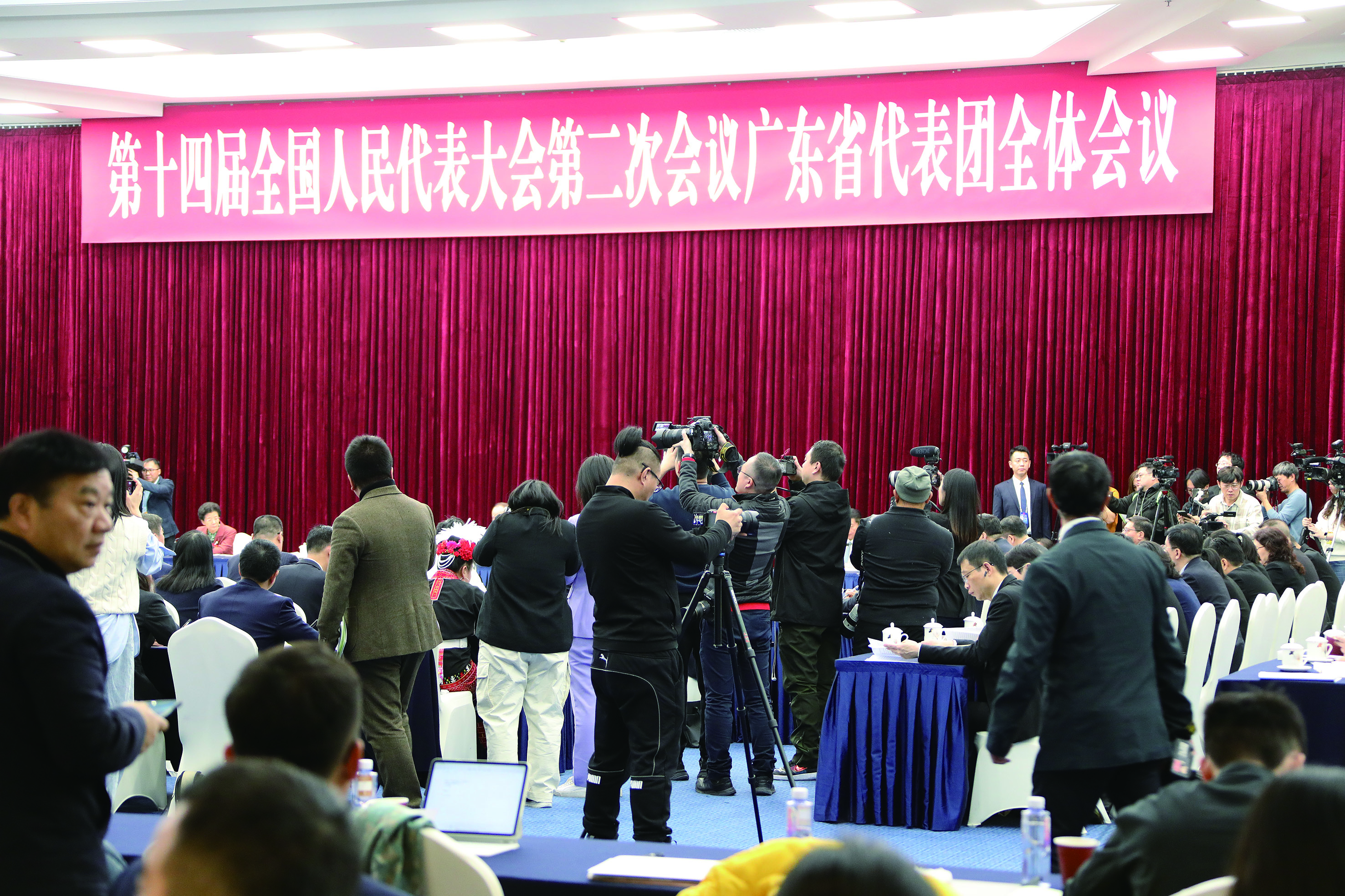 但会议开始后没多久,广东代表团邀请媒体区的摄影摄像记者进入代表发言区拍摄,“让记者朋友们到前面来拍吧!你们到前面来拍,就可以从不同角度拍到所有代表了。”话音一落,全场响起热烈掌声,记者们纷纷跨步向前。这一下,会场一下子变成直播间了。这成了名副其实的“开放日”,彻底让记者放飞了。