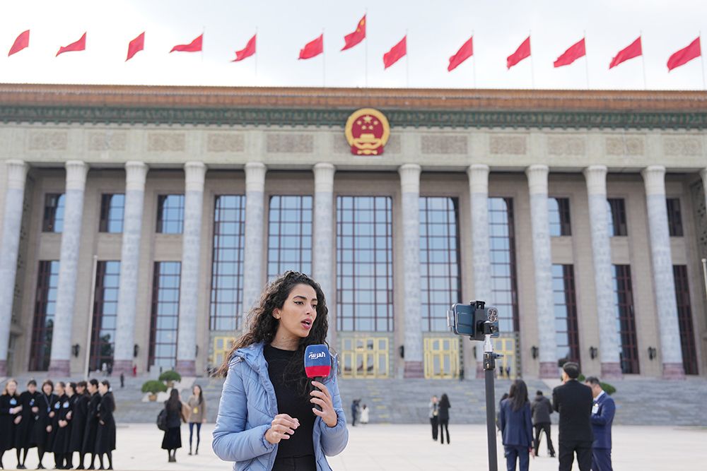 3月11日,十四届全国人大二次会议在北京人民大会堂举行闭幕会。图为外国记者报道闭幕会。(图片来源:中新社)