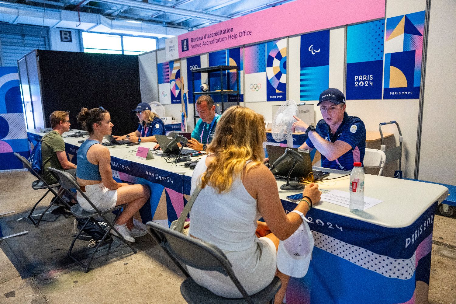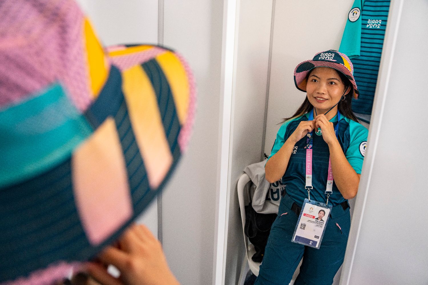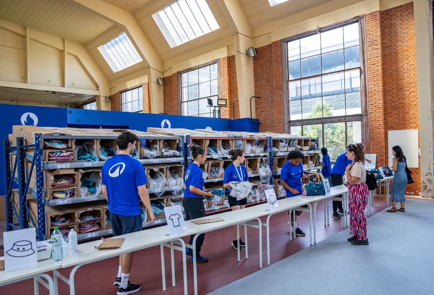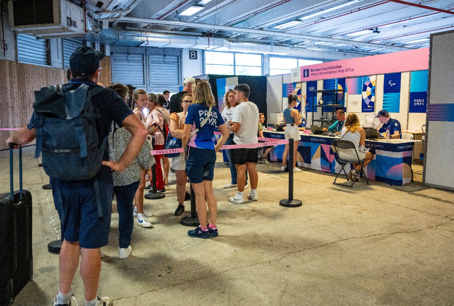 近日,巴黎奥运会志愿者在志愿者装备分发中心领取身份认证卡、服装、公共交通卡等物品。