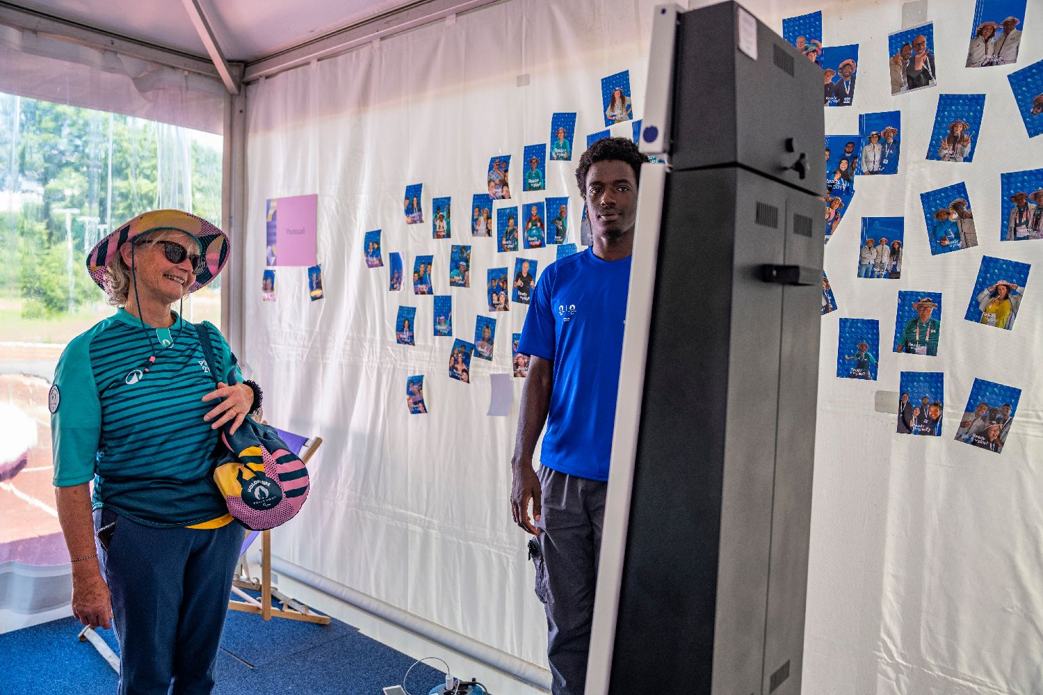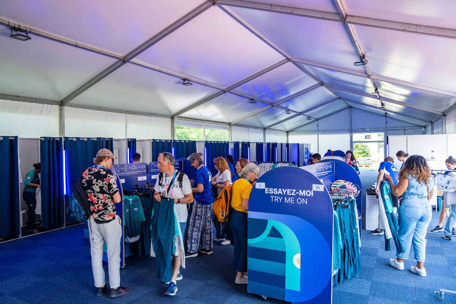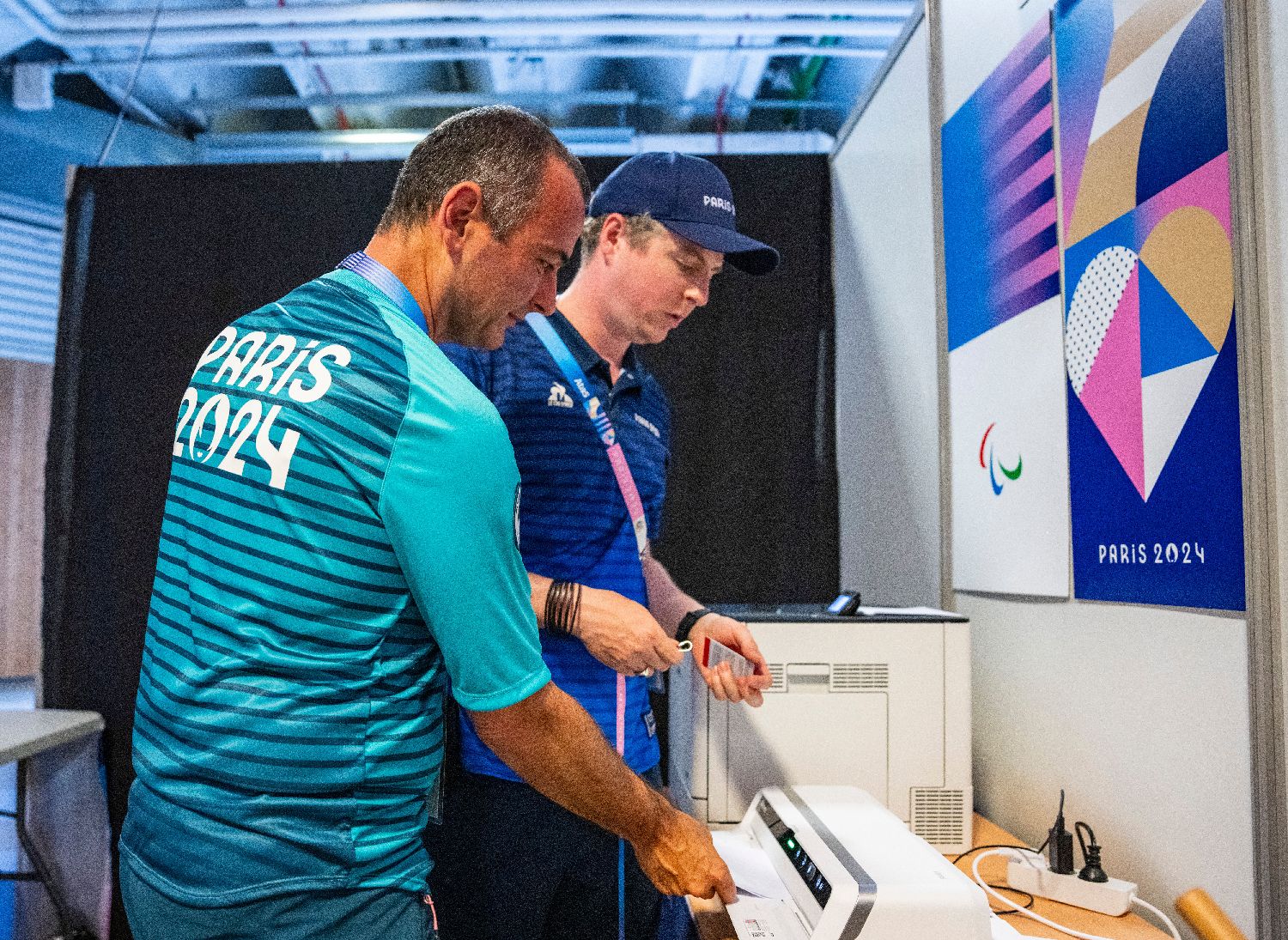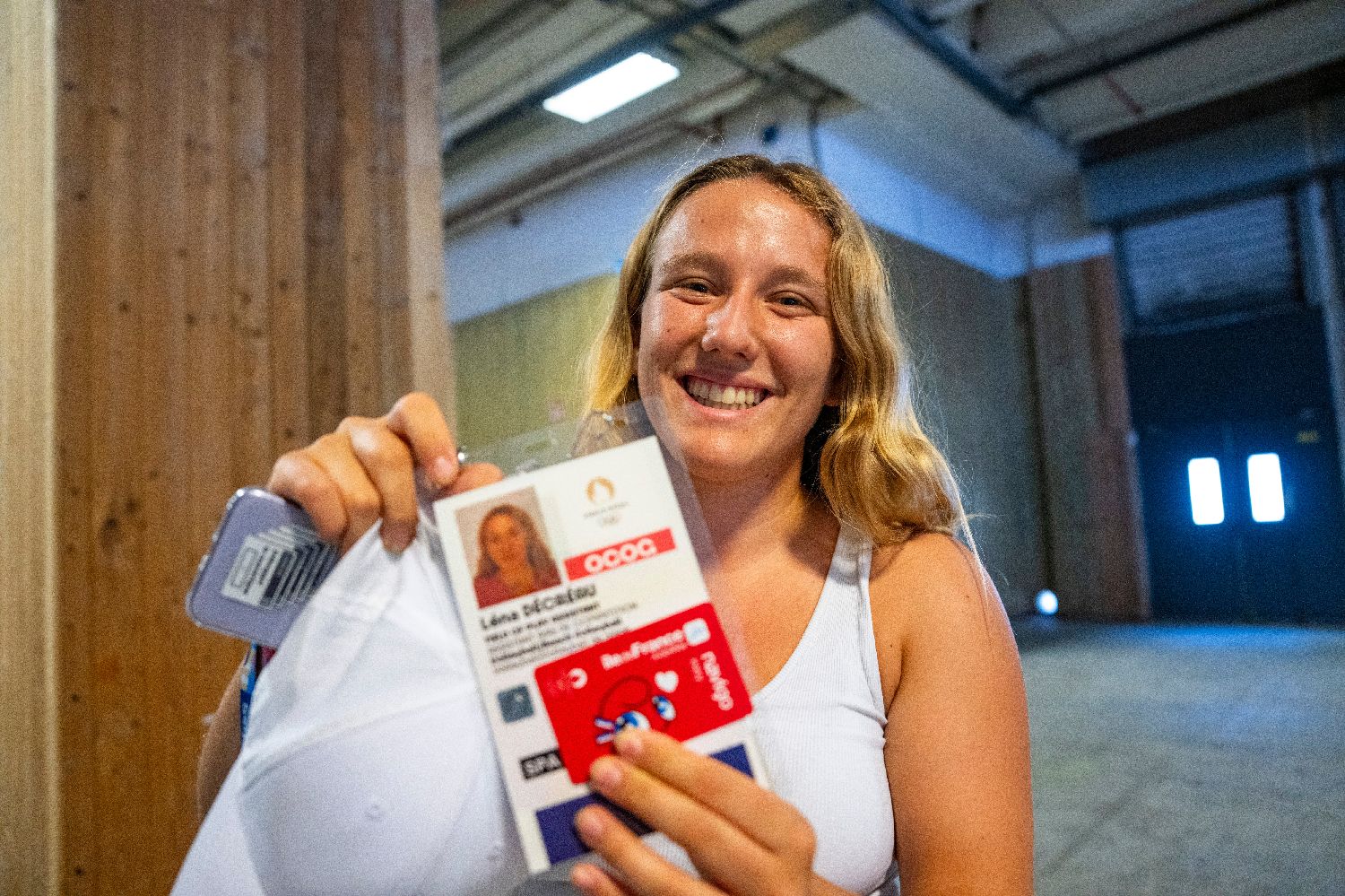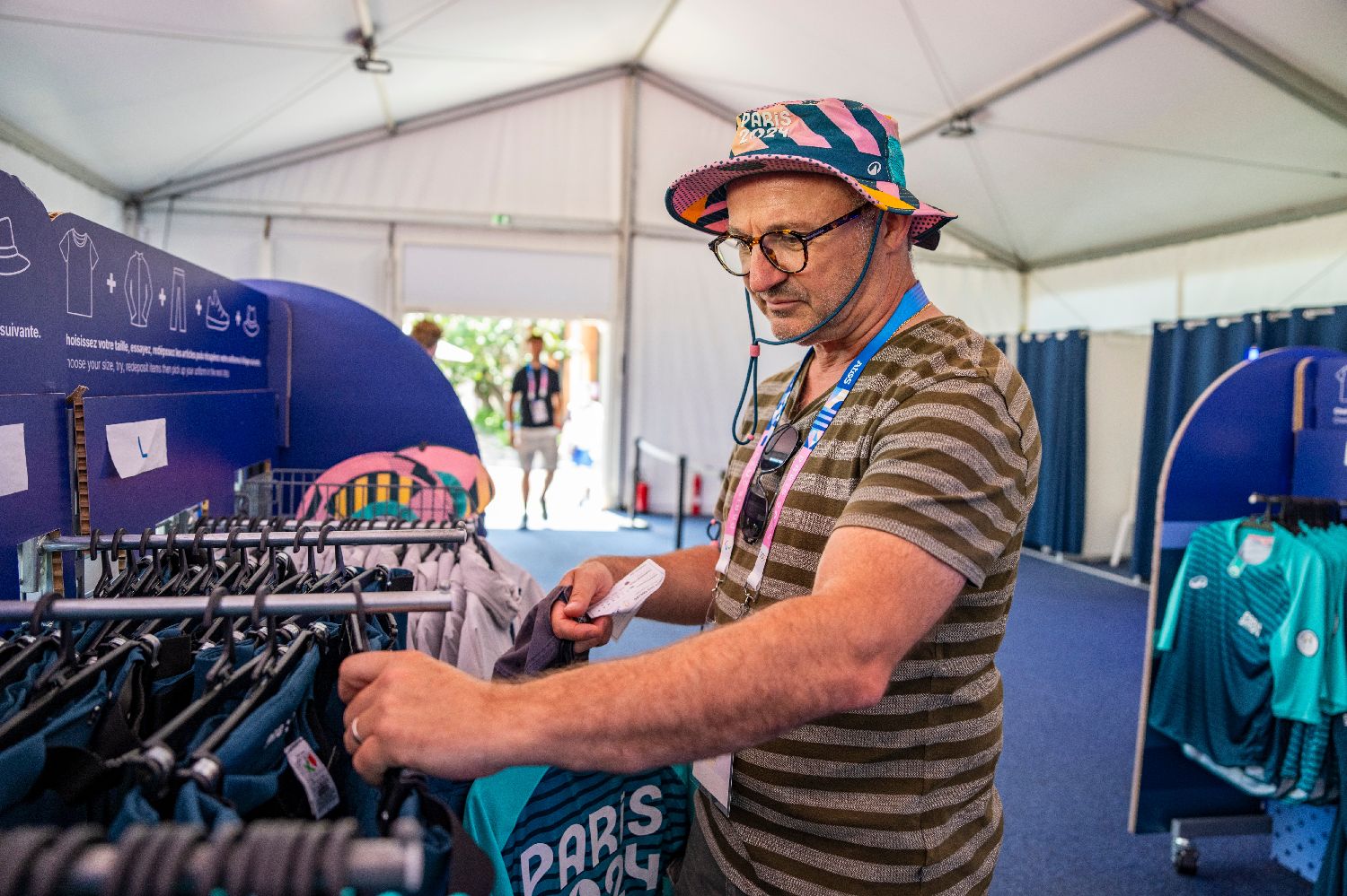 近日,巴黎奥运会志愿者在志愿者装备分发中心领取身份认证卡、服装、公共交通卡等物品。