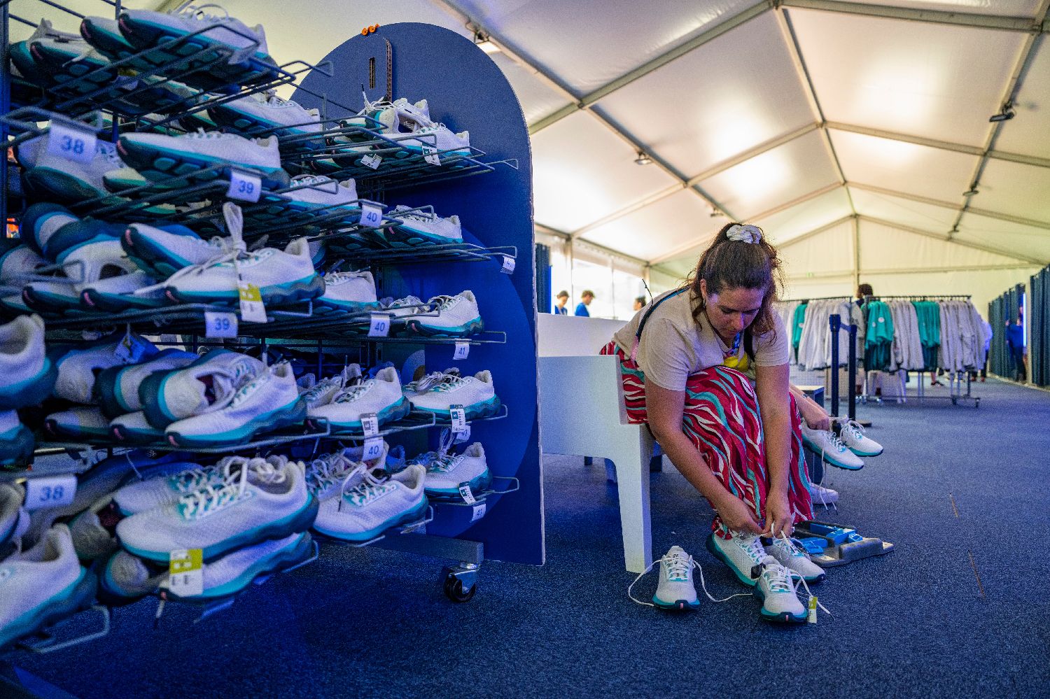 图为7月19日, 一名志愿者在装备分发中心内试穿鞋子。