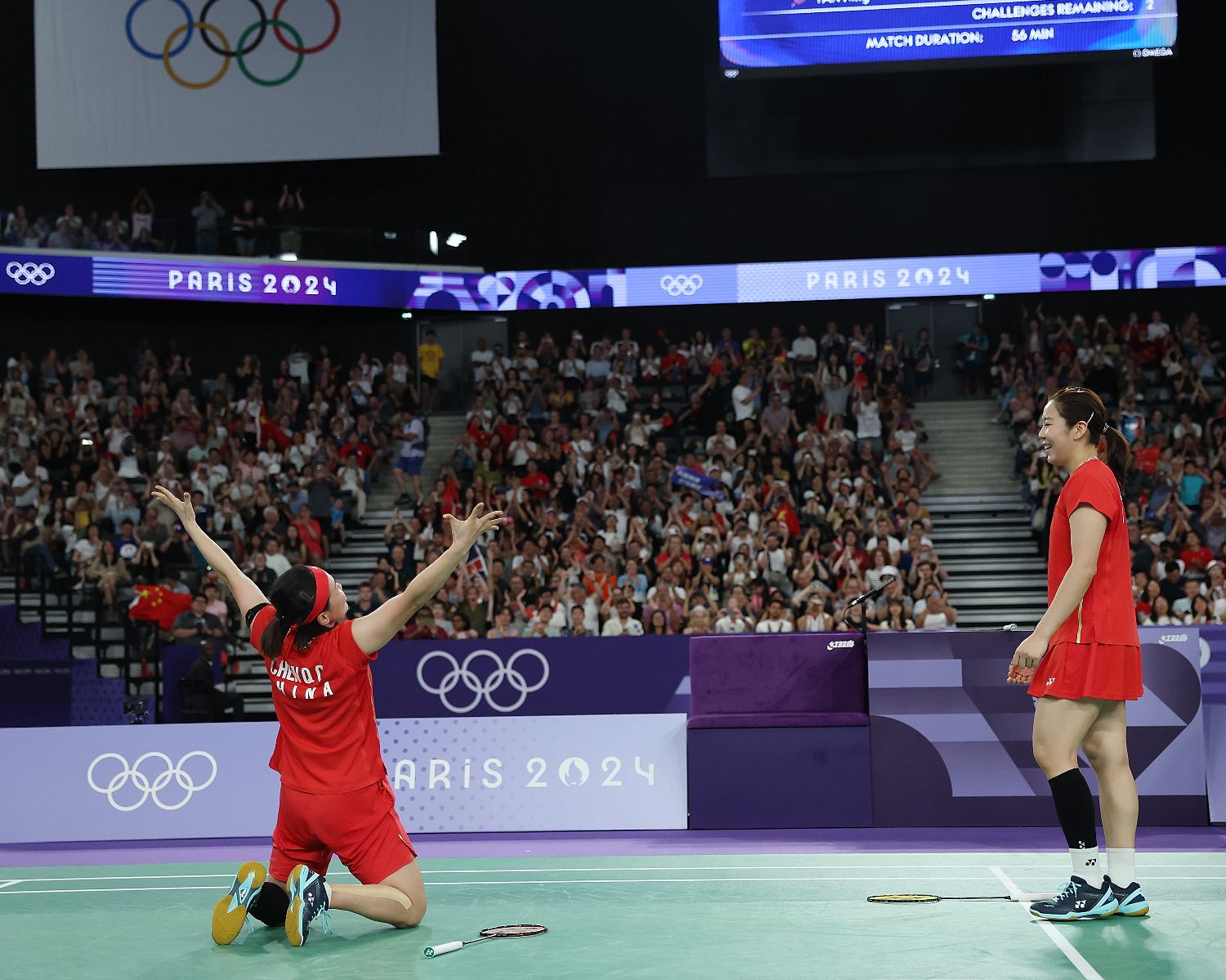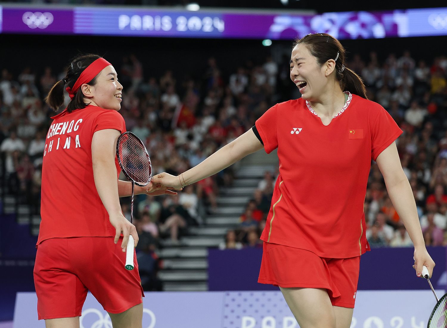 3日,在巴黎奥运会羽毛球项目女双决赛中,两对中国组合展开较量。最终,陈清晨/贾一凡2比0战胜刘圣书/谭宁,夺得金牌。图为陈清晨(左)/贾一凡在比赛中庆祝得分。(图片来源:图片均据新华社)