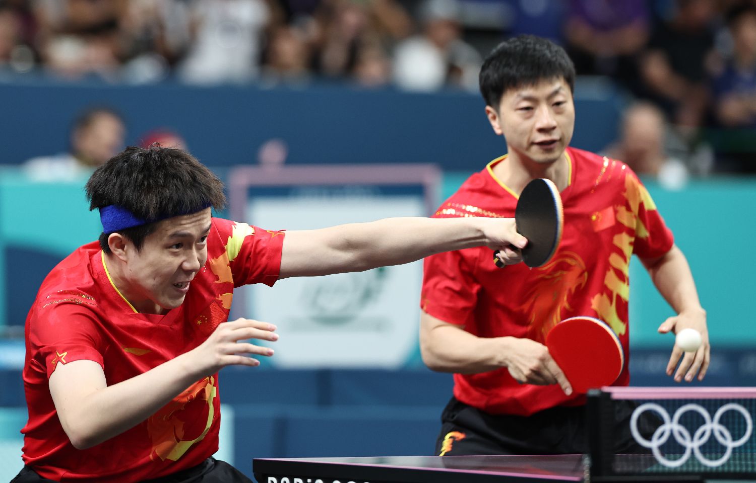 6日,在巴黎奥运会乒乓球男团16强赛的比赛中,中国队3比0战胜印度队,晋级八强。图为中国队选手马龙(右)/王楚钦在比赛中。(图片来源:图片均据新华社)