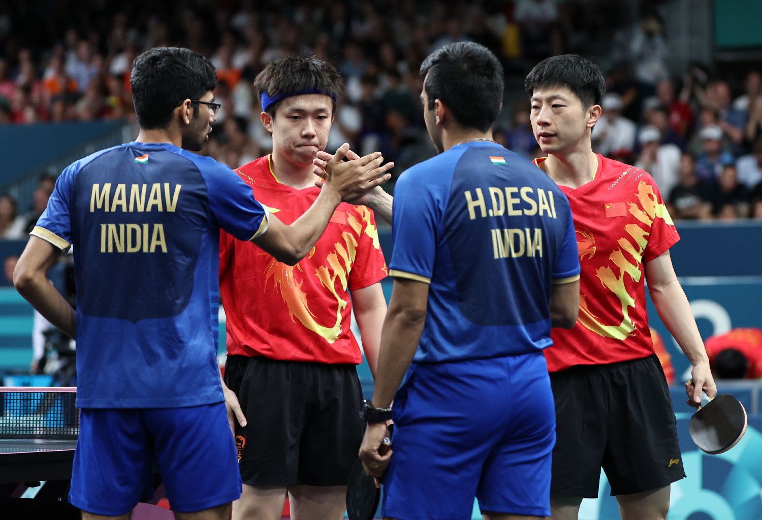图为中国队选手马龙(右一)/王楚钦(左二)在比赛后和印度队选手致意。