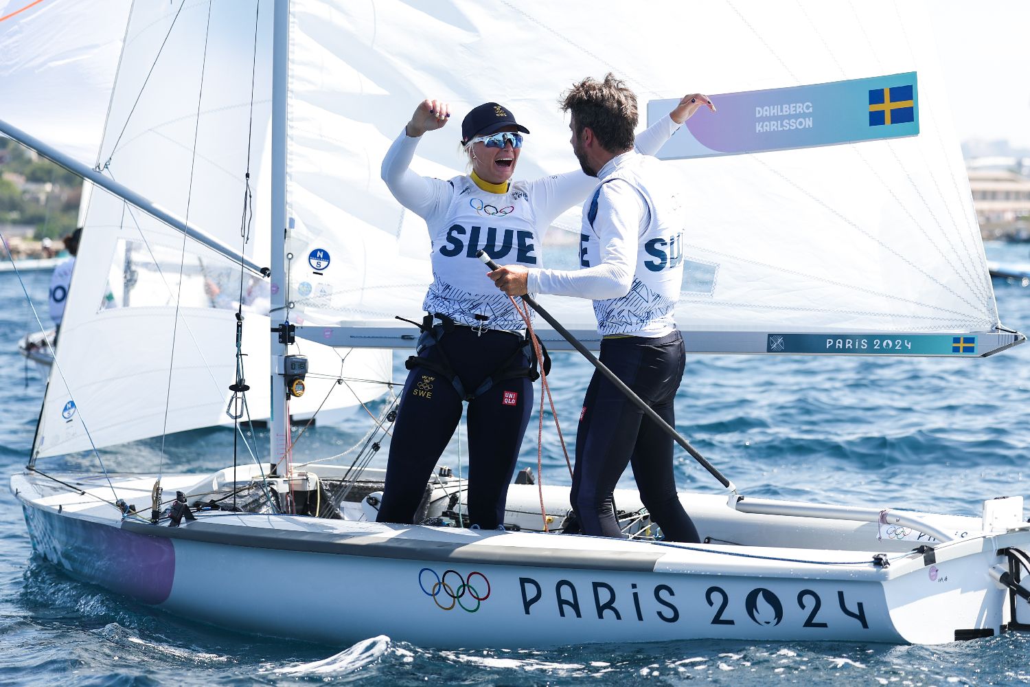 8月8日,瑞典组合达尔贝里(右)/卡尔松在奖牌轮后庆祝。