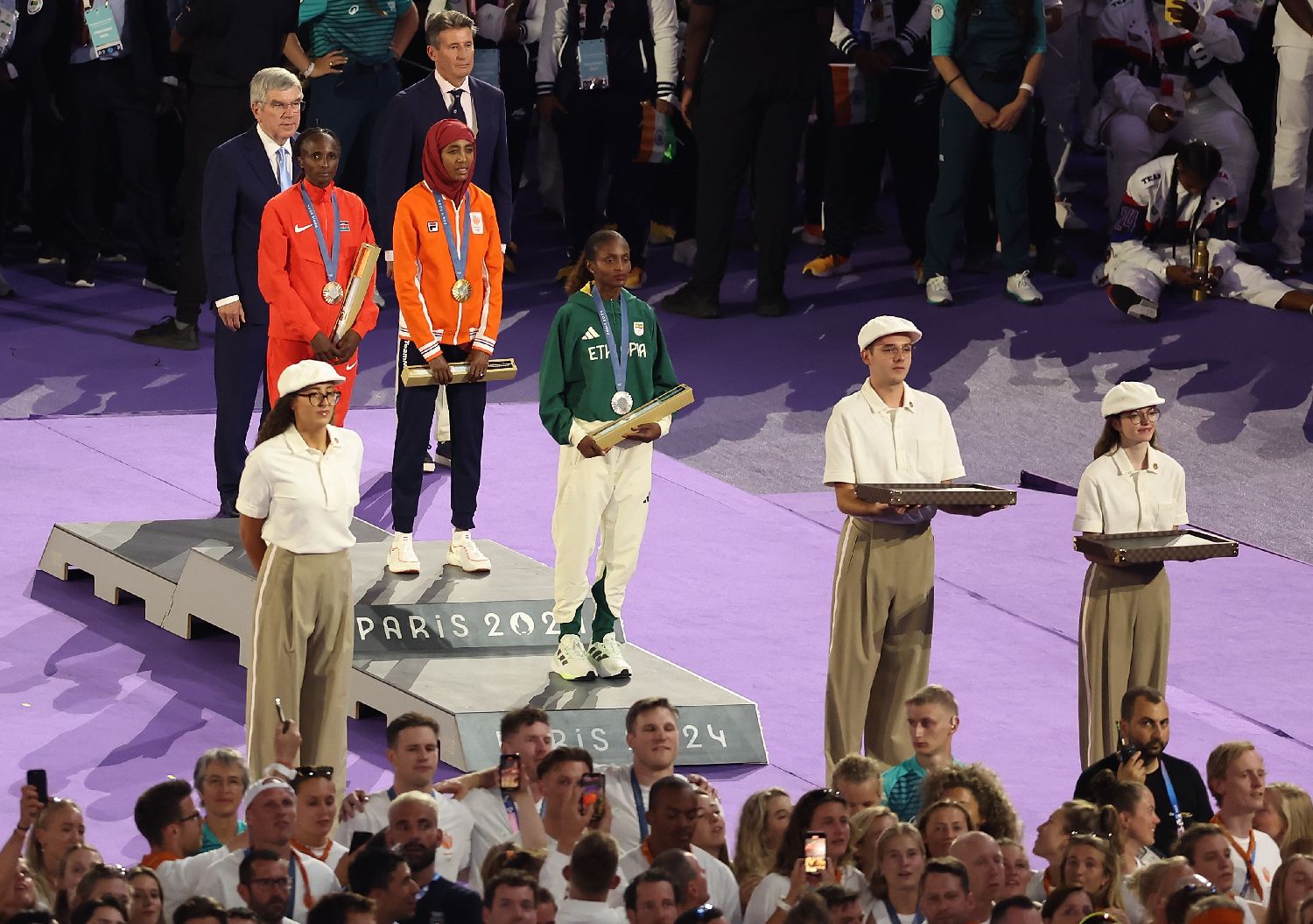 8月11日,女子马拉松冠军荷兰选手茜凡·哈桑(中)、亚军埃塞俄比亚选手蒂格瑟特·阿塞法(前)和季军肯尼亚选手海伦·奥比里(后)在闭幕式举行的颁奖仪式上。