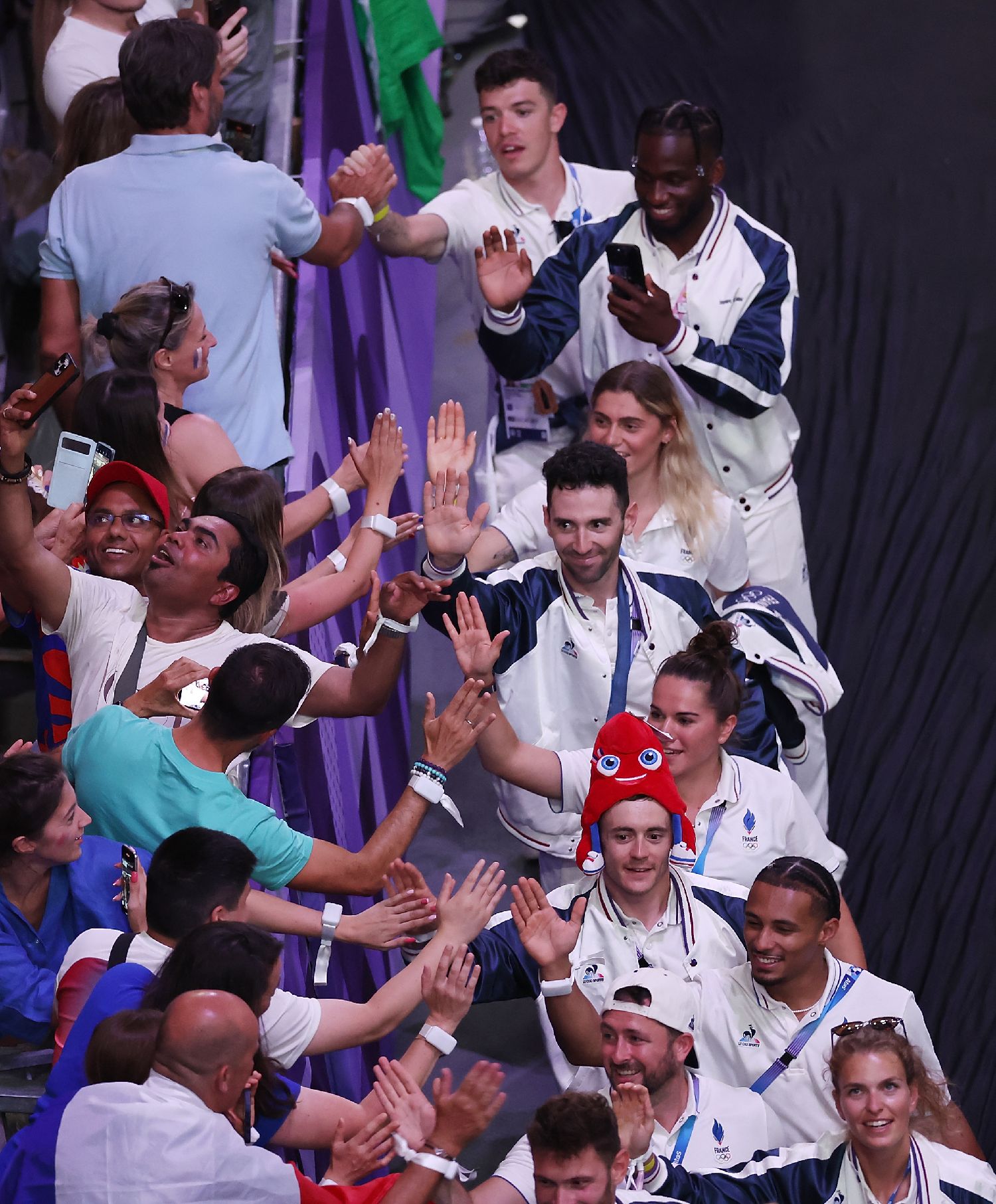 8月11日,法国体育代表团(右)在闭幕式上与观众互动。