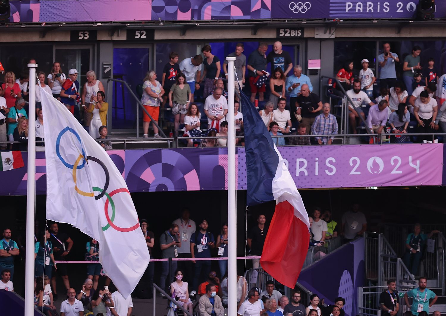 8月11日在闭幕式上拍摄的法国国旗和奥林匹克会旗。