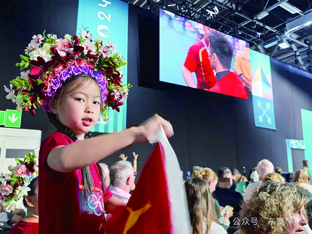 在举重男子61公斤级比赛中,观众席上6岁的中国泉州女孩头戴簪花为中国选手加油助威。(图片来源:《东南早报》微信公众号)