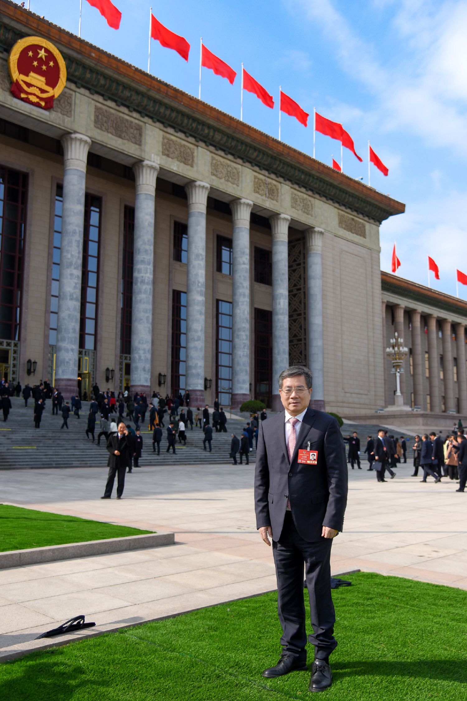 全国政协委员、浙江省侨联兼职副主席、贝达药业股份有限公司董事长丁列明 在人民大会堂前留影。(图片来源:欧洲时报特派记者黄冠杰 摄)