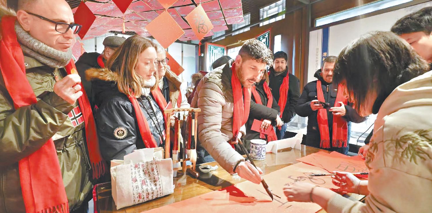在书法体验区,外国游客书写福字和英文趣味春联,在笔墨流转中感受中国书法的独特韵味。(图片来源:程功 摄 )