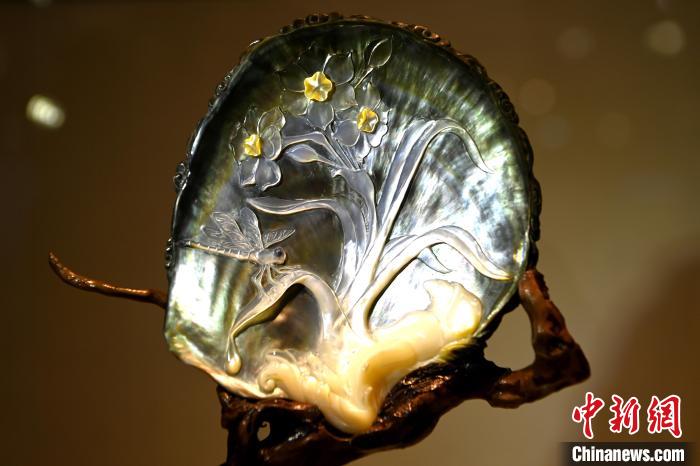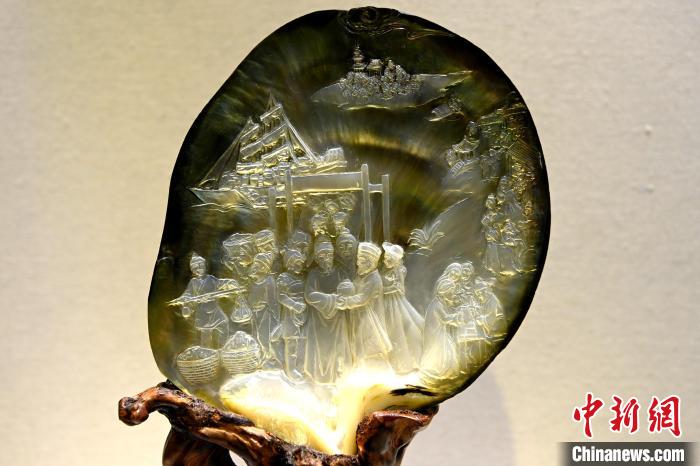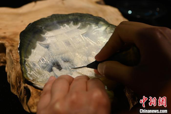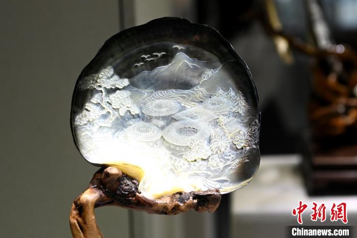 图为贝雕作品《海上丝绸》,在黑蝶贝上雕刻古代海上丝绸之路重要始发港漳州月港的贸易盛景。