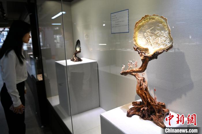 图为3月28日,翁清香在福建省漳州市工艺美术馆介绍闽南贝雕作品。(图片来源:本文图片均来自中新网)