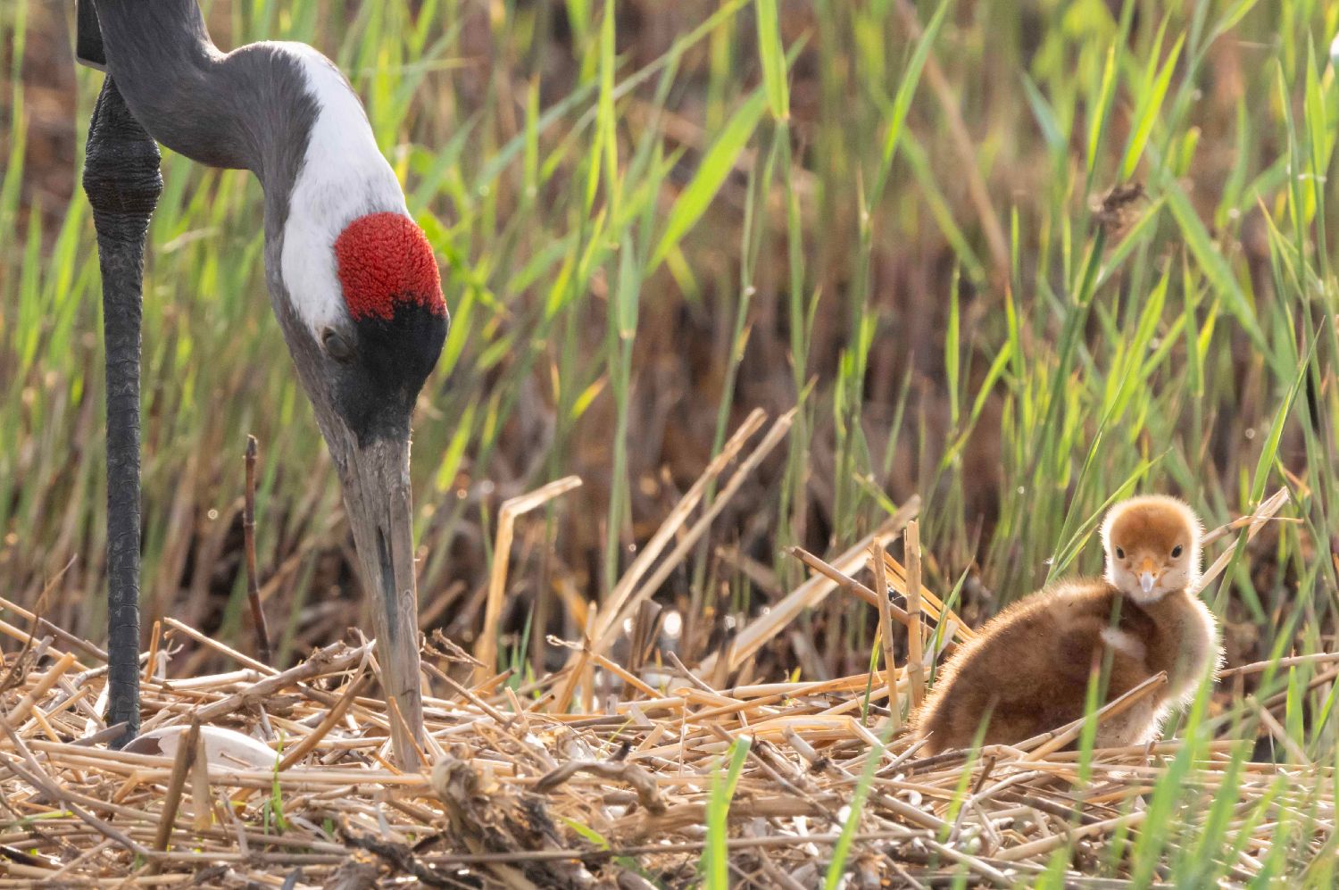14日,在黑龙江扎龙国家级自然保护区,丹顶鹤雏鸟在亲鸟旁边玩耍。