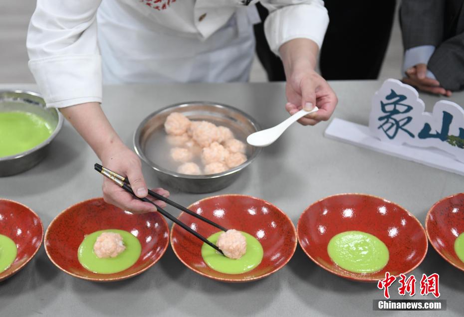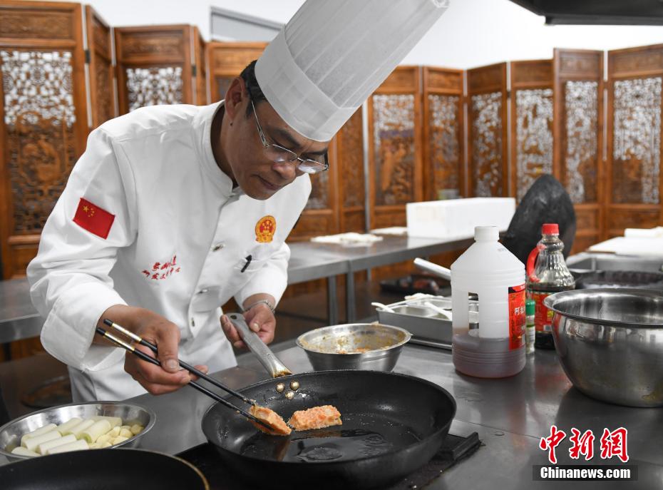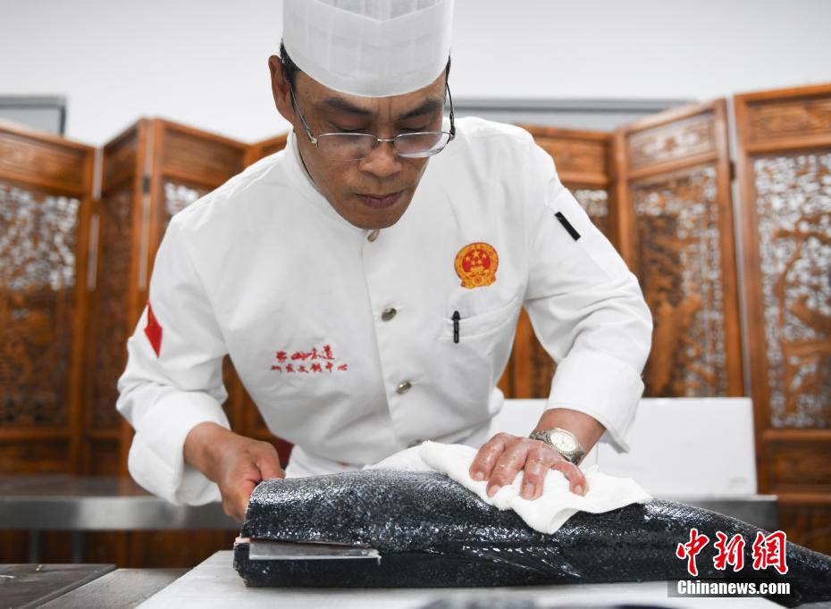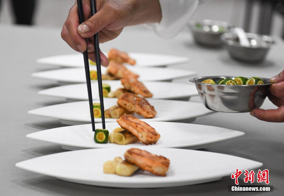 近日,位于浙江宁波象山的亚洲首个循环水陆基鲑鱼(三文鱼)养殖基地迎来出鱼期。该项目数年前引入来自北欧的大西洋鲑鱼卵,在象山基地通过循环水等技术进行养殖,生长两年后目前已上市44吨鲑鱼。在宁波象山,当地厨师在三文鱼制作中引入中式烹饪进行探索,可做出三文鱼狮子头、京葱焗三文鱼排等7道菜品。图为中国烹饪高级技师许赛明制作京葱焗三文鱼排。(图片来源:本文图片均据中新网)