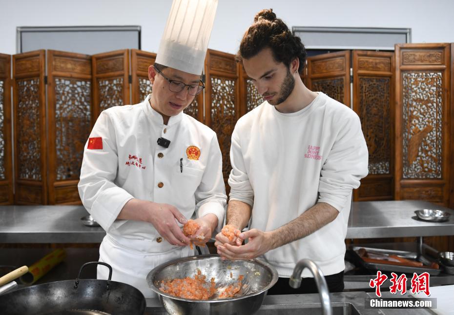 外籍友人跟随一级中式烹调师楼成敏学习制作三文鱼狮子头。