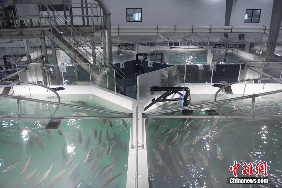 大量的大西洋鲑鱼(三文鱼)在循环水养殖塘内游动。