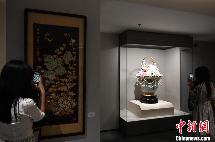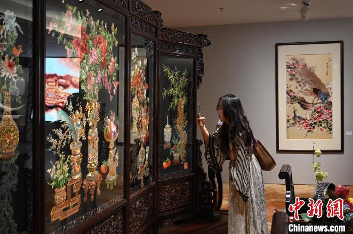 广东省非物质文化遗产馆展出粤绣(潮绣)代表性传承人康惠芳的《岁朝清供》吸引参观者拍照。