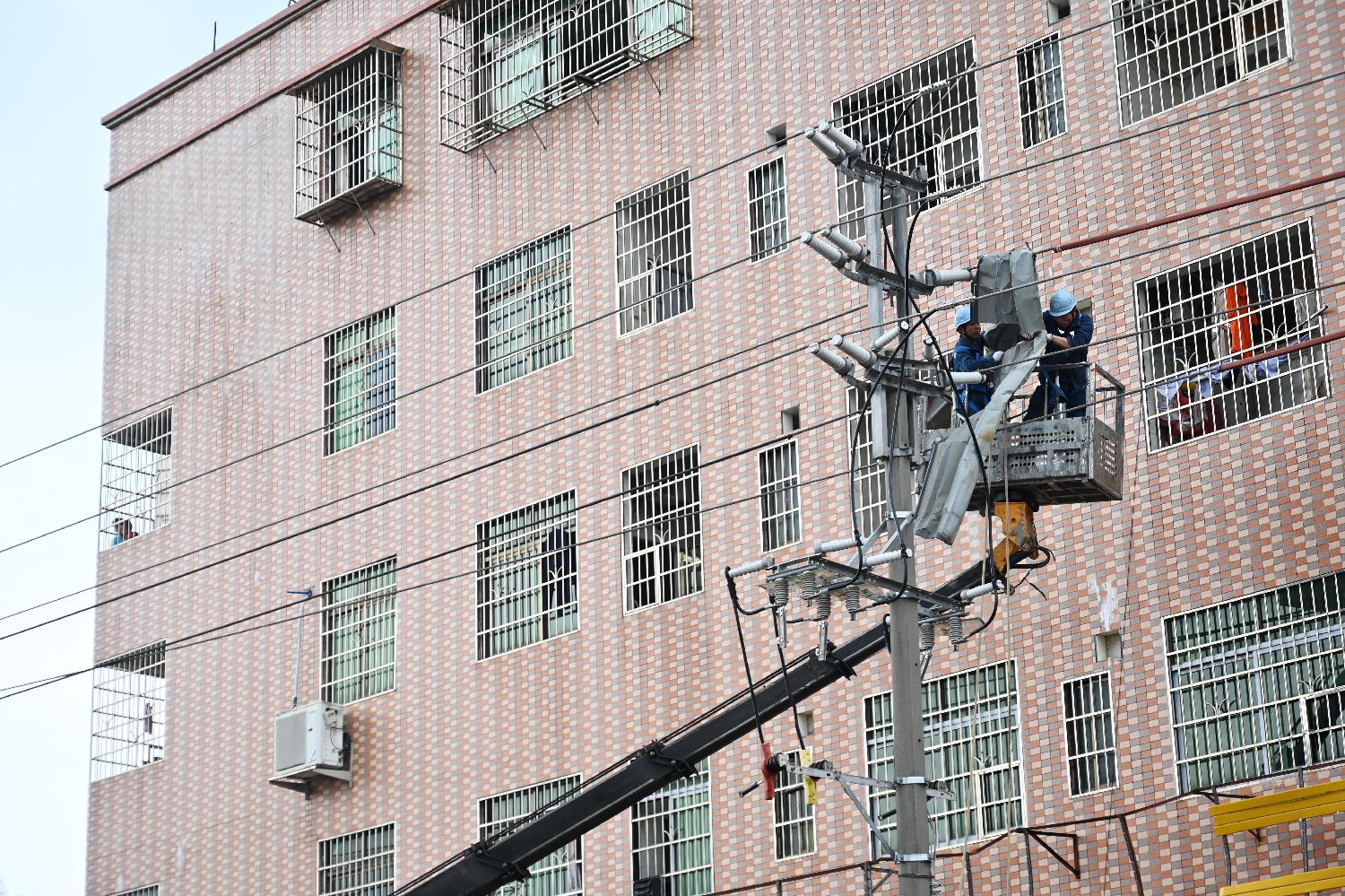 工作人员在光明村开展电力抢修、清理厂房工作。